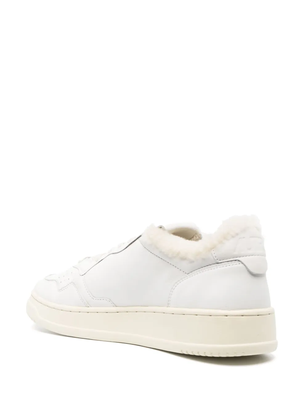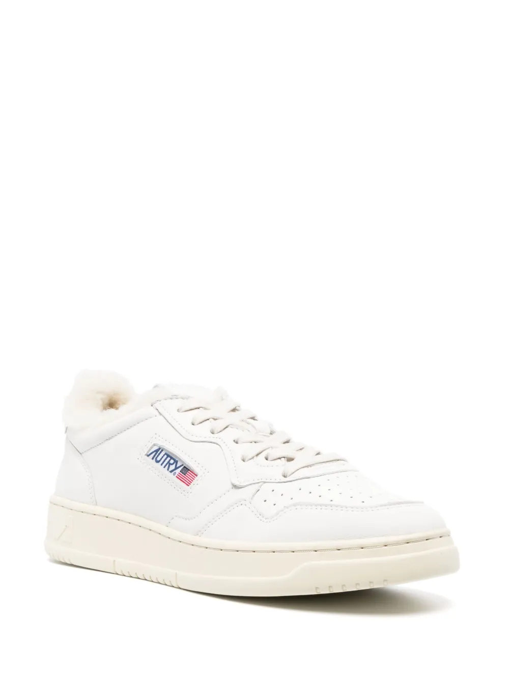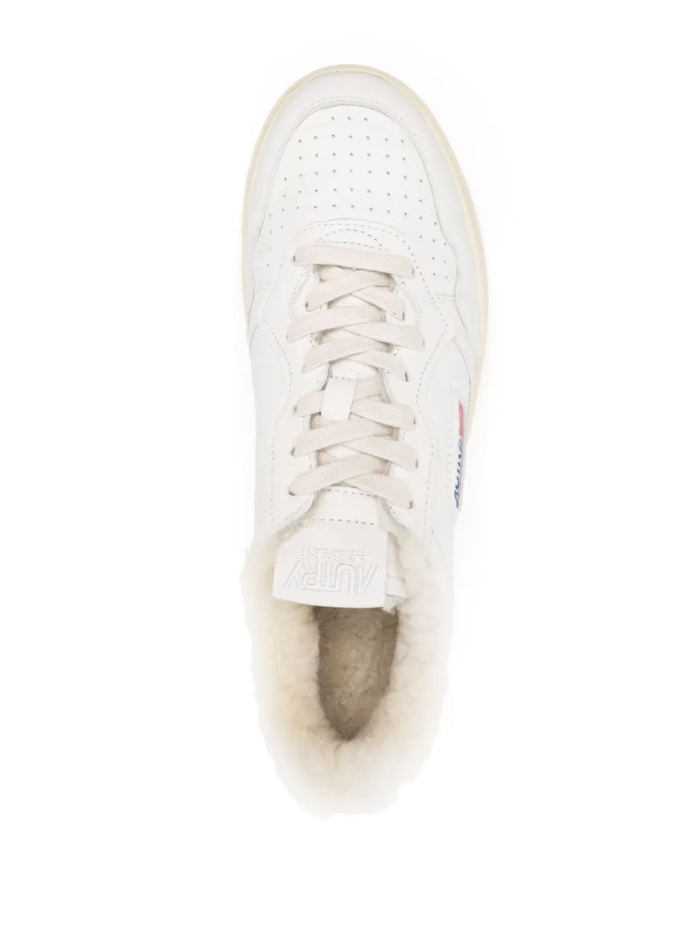 Белый, козья кожа, перфорированный носок, нашивка с логотипом на язычке, вышитый логотип сбоку, задник с логотипом, отделка из овчины, закругленный носок, шнуровка спереди, стелька с логотипом и плоская резиновая подошва.
