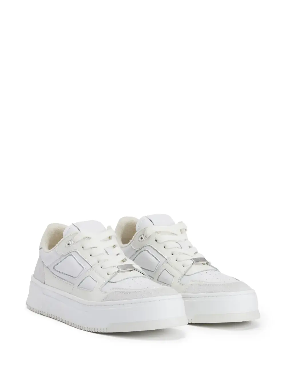 Белый, телячья кожа, смесовый хлопок, вставки, закругленный носок, шнуровка спереди, стелька с логотипом и плоская резиновая подошва.
