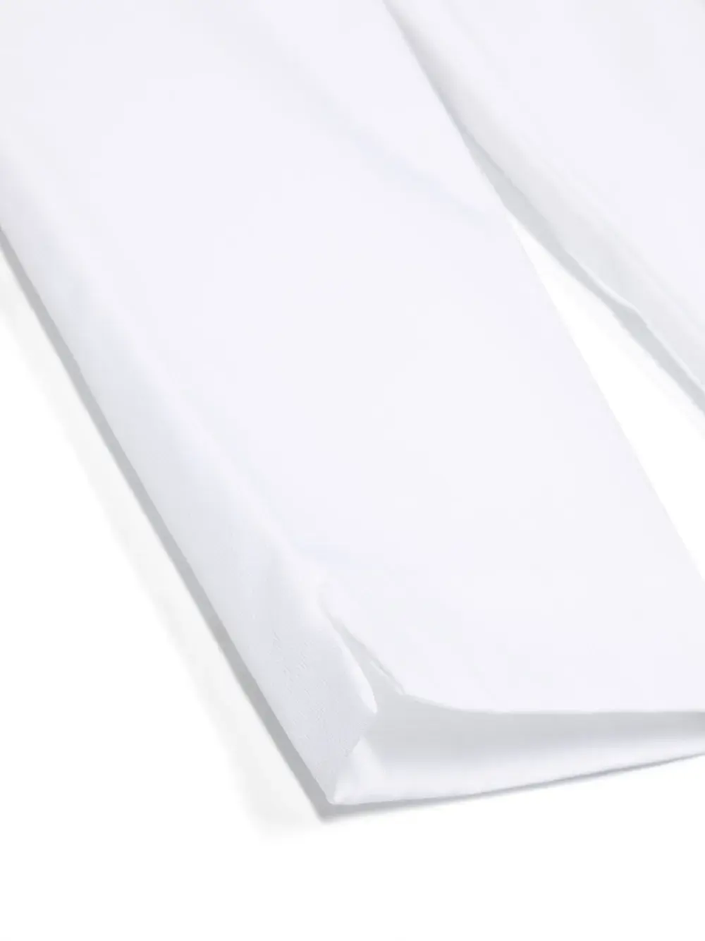 Белый, эластичный хлопок, эластичный пояс, два кармана по бокам, прямой крой и боковые разрезы.