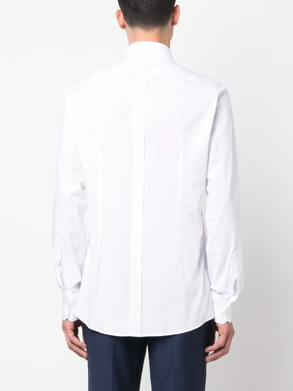 Белый, эластичный хлопок, плоский заостренный воротник, застежка на пуговицах спереди, встречная складка, длинные рукава, манжеты на пуговицах и закругленный подол.