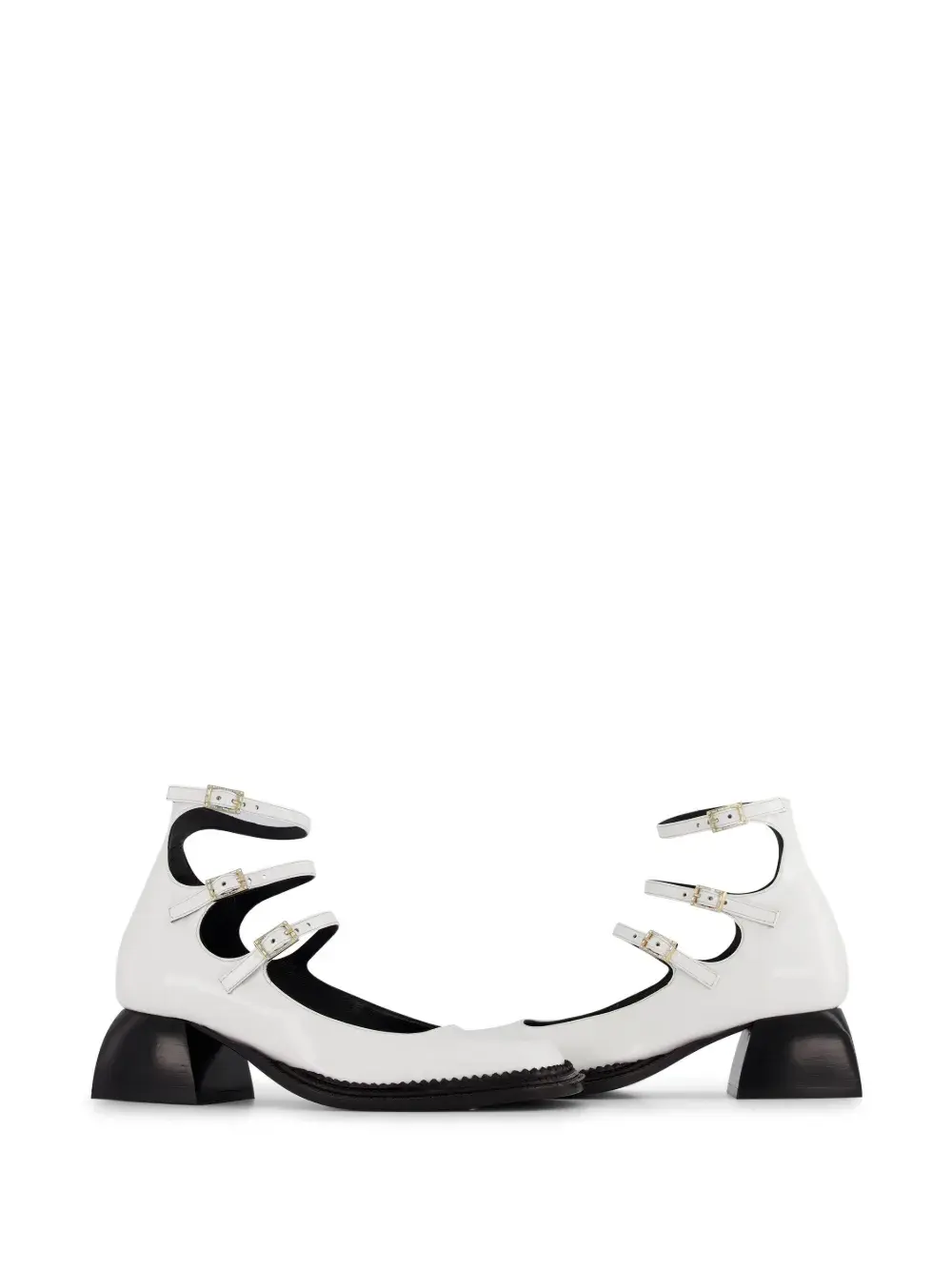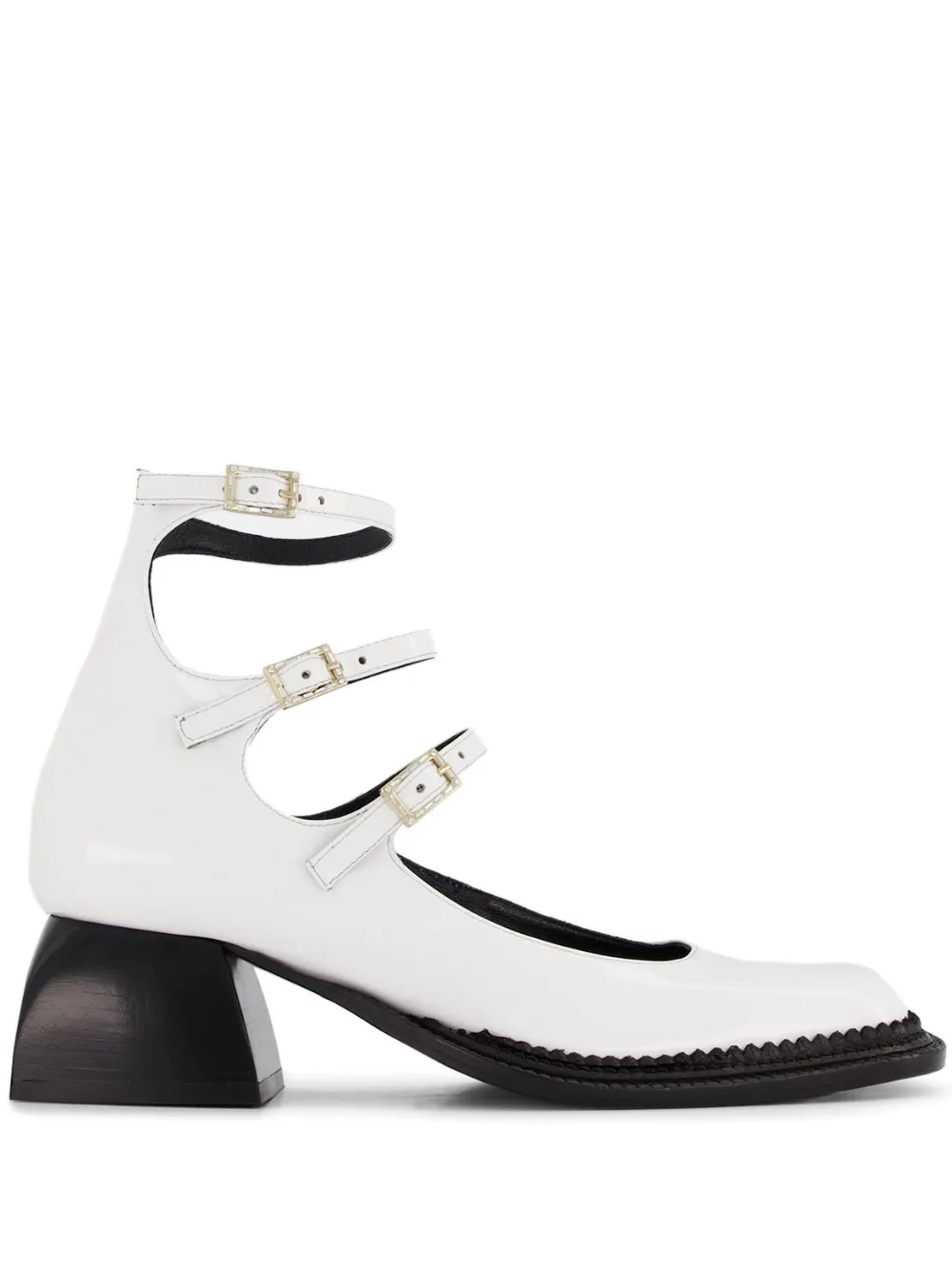Белый, кожа, лакированная отделка, квадратный носок, застежка на пряжке и ремешке, кожаная стелька с логотипом и блочный каблук.