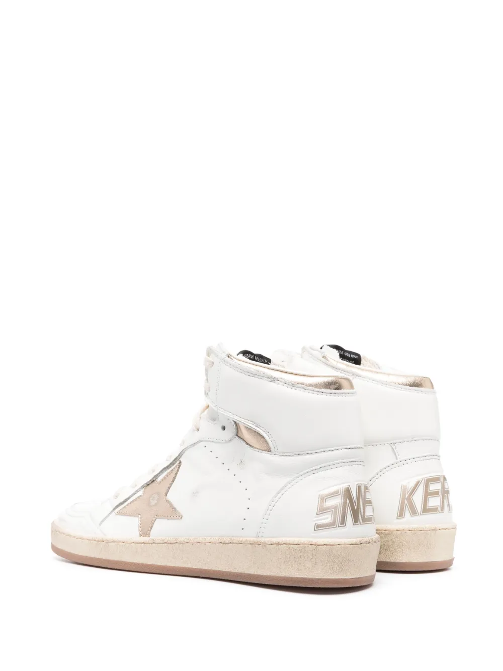 Белый, нашивка в форме звезды сбоку, шнуровка спереди, закругленный носок и плоская подошва.