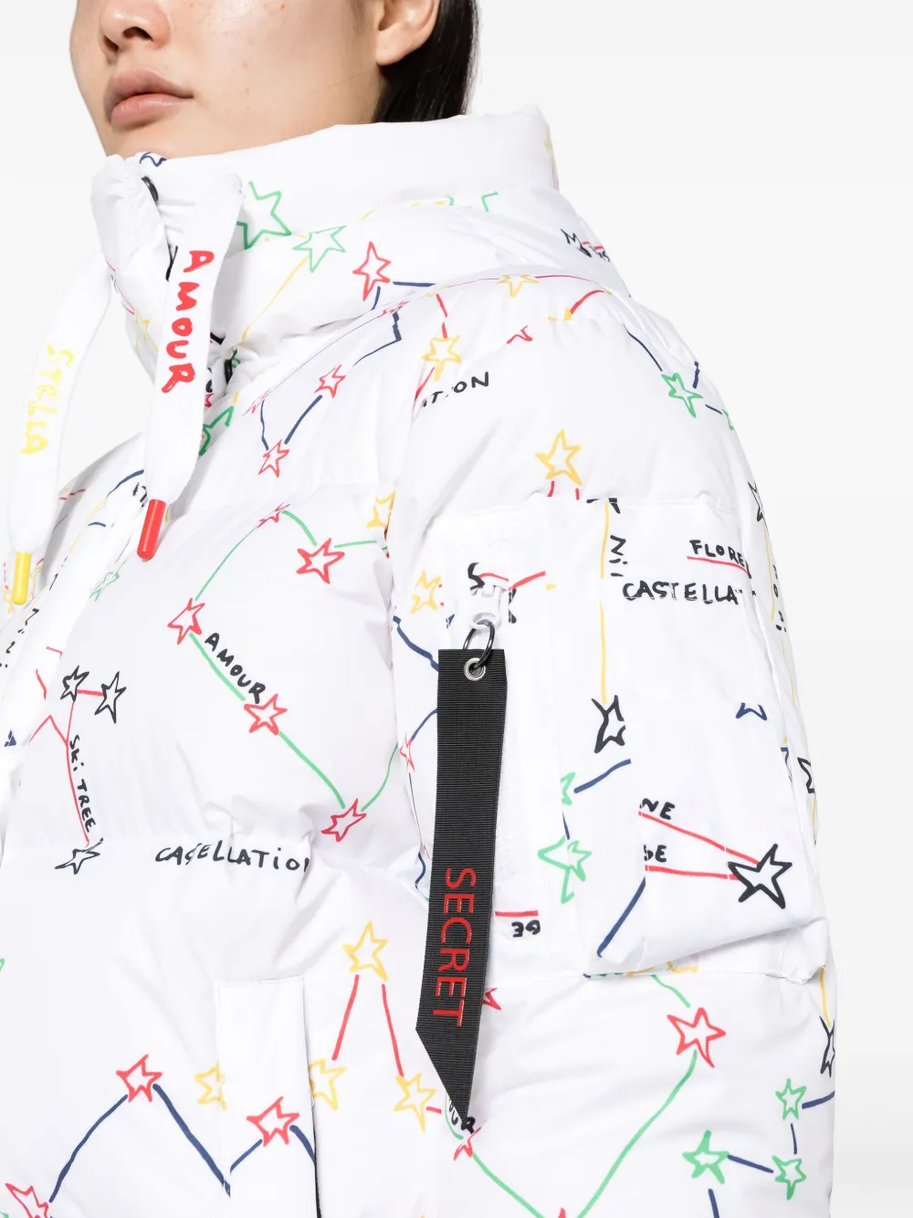 Белый/разноцветный, наполнитель из пуха и перьев, дутый материал, сплошной графичный принт, нашивка с логотипом сзади, классический капюшон, воротник-труба, потайная застежка спереди, длинные рукава, карман с молнией на рукаве, передние карманы на молнии и прямой подол.