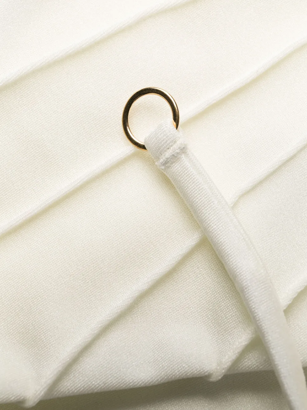 Экрю, эластичный материал, дизайн со сборками, треугольная чашка, завязки вокруг шеи, застежка на завязке сзади и низкая посадка. Пожалуйста, примеряйте купальники и пляжные шорты только поверх собственного белья.