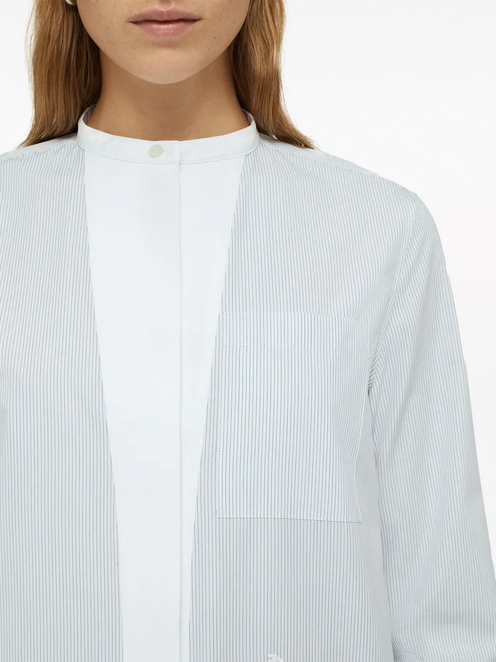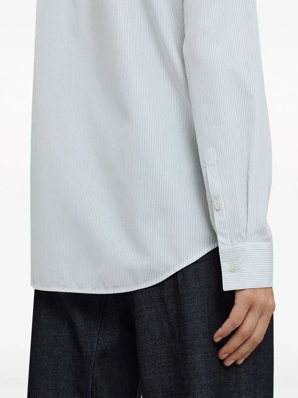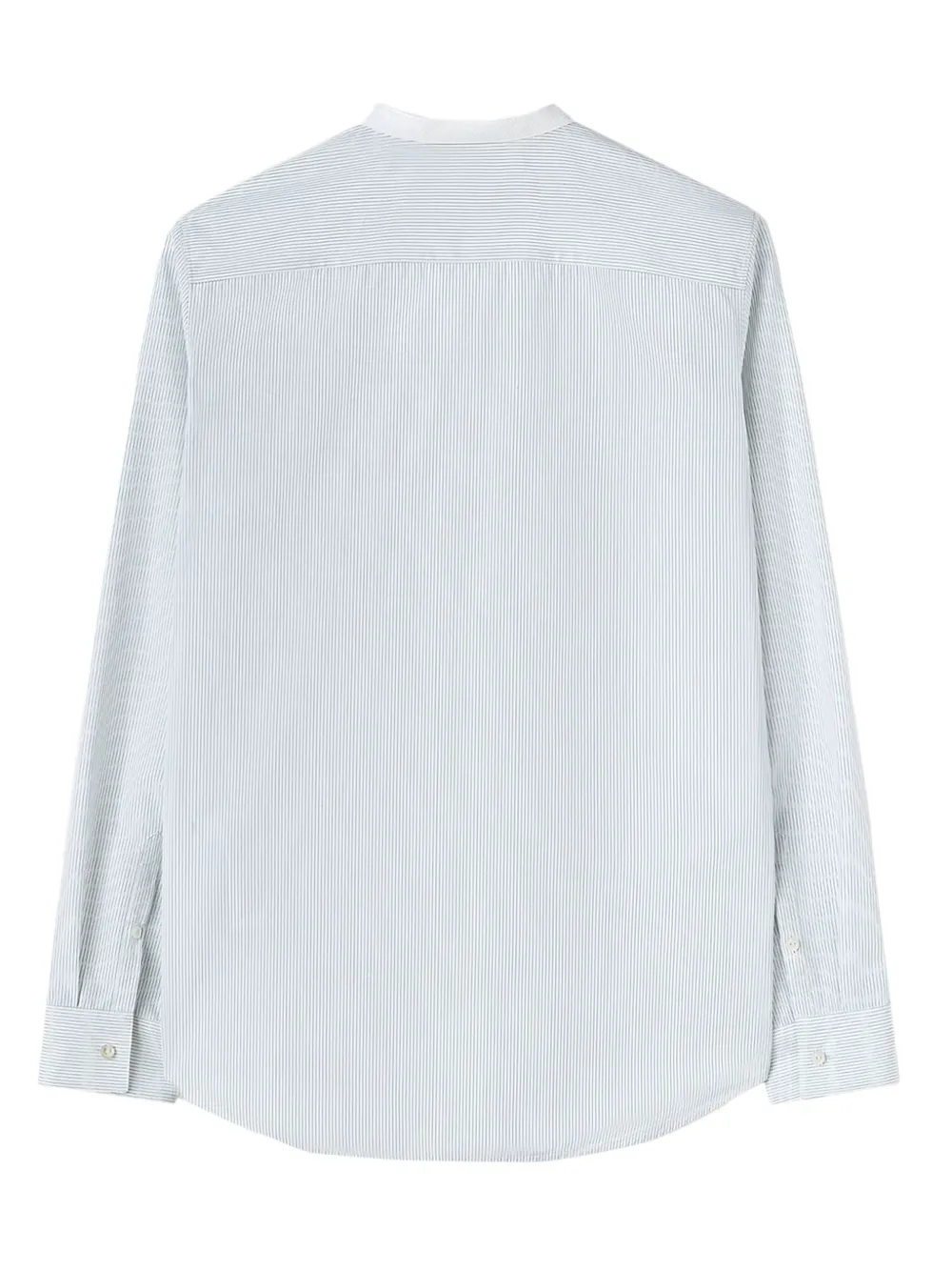 Белый, хлопок, узор в вертикальную полоску, воротник-стойка, застежка на пуговицах спереди, длинные рукава, нагрудный накладной карман, манжеты на пуговицах и закругленный подол.