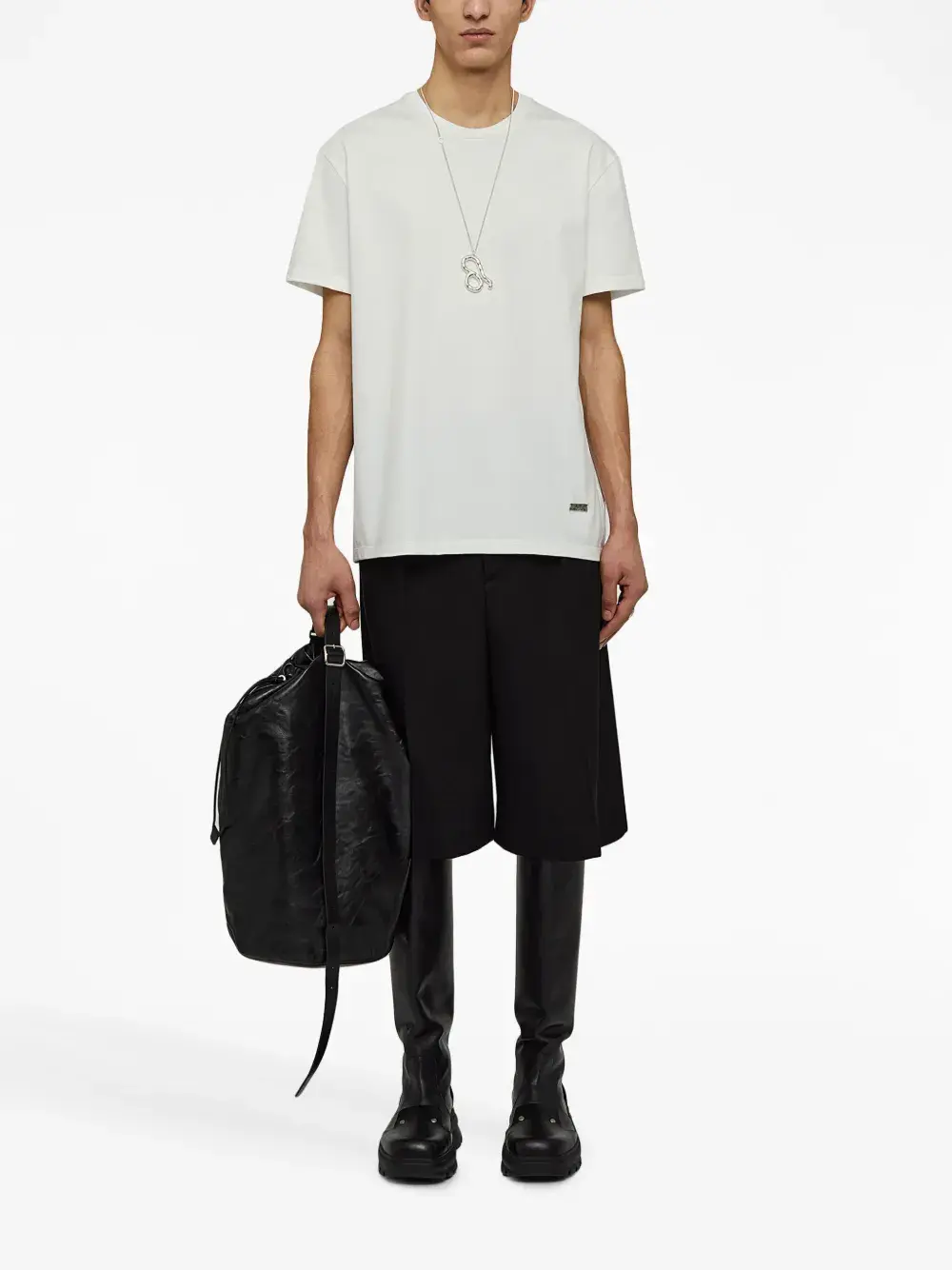 Кремовый, хлопок, металлический логотип, круглый вырез, приспущенные плечи, короткие рукава и прямой подол.