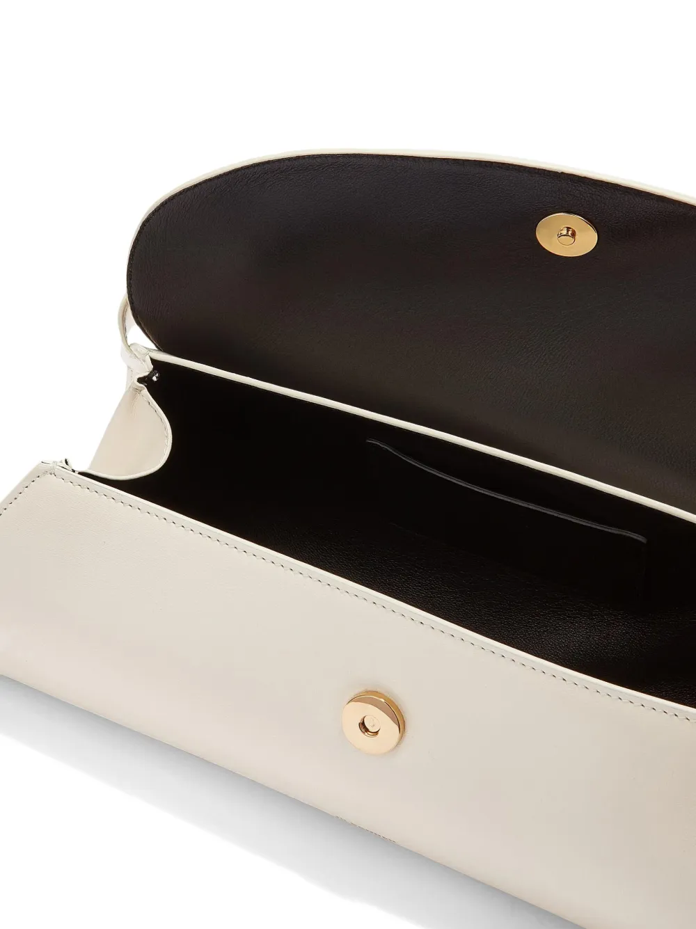 Кремово-белый, телячья кожа, золотистая фурнитура, тисненый логотип спереди, регулируемый ремень на плечо, откидной клапан на магните, основное отделение, тисненый логотип внутри и внутренний прорезной карман.