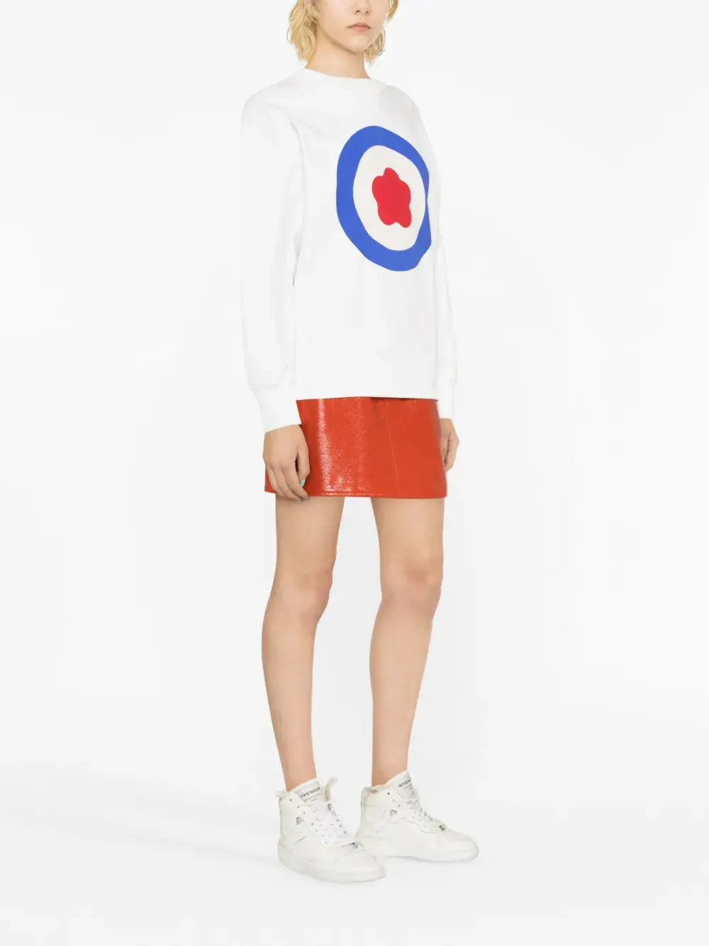 Белый, хлопок, логотип спереди, принт с логотипом сзади, круглый вырез, приспущенные плечи, длинные рукава и прямой подол.