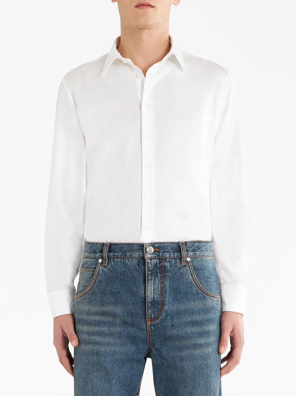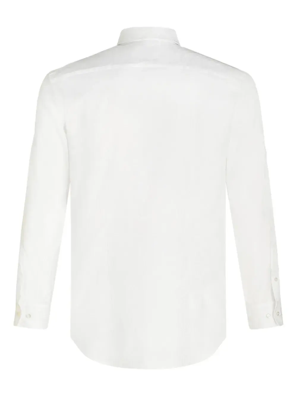 Белый, классический воротник, застежка на пуговицах спереди, длинные рукава, манжеты на пуговицах и прямой подол.