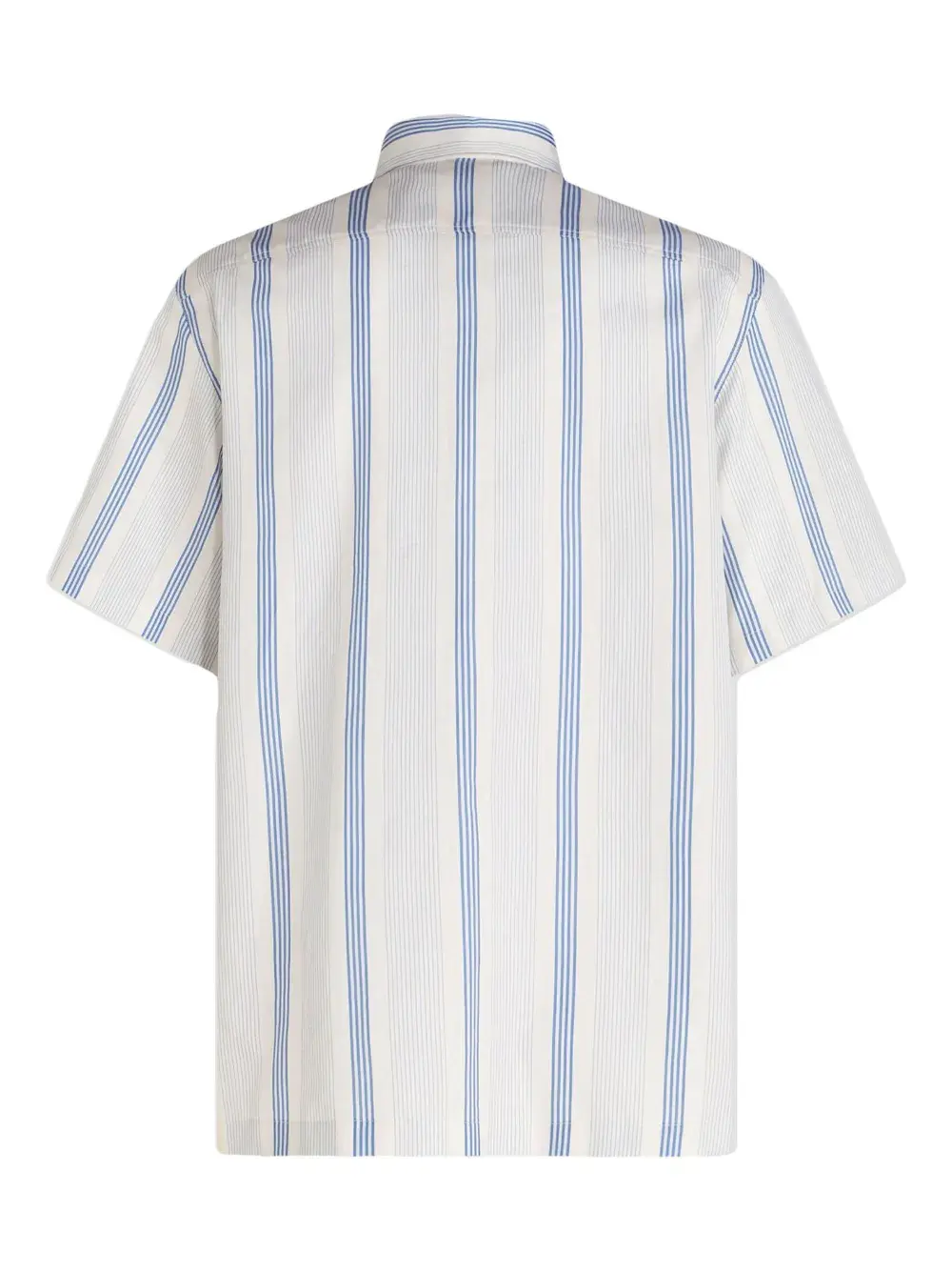 Синий, хлопок, узор в тонкую полоску, узор Pegaso, вышитый логотип на груди, отложной воротник, застежка на пуговицах спереди, короткие рукава и прямой подол.