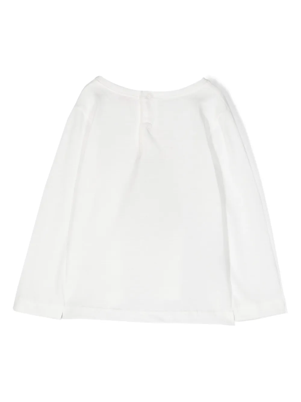 Белый/разноцветный, хлопок, графичный принт спереди, аппликация, круглый вырез, застежка на пуговицы сзади, длинные рукава и прямой подол.