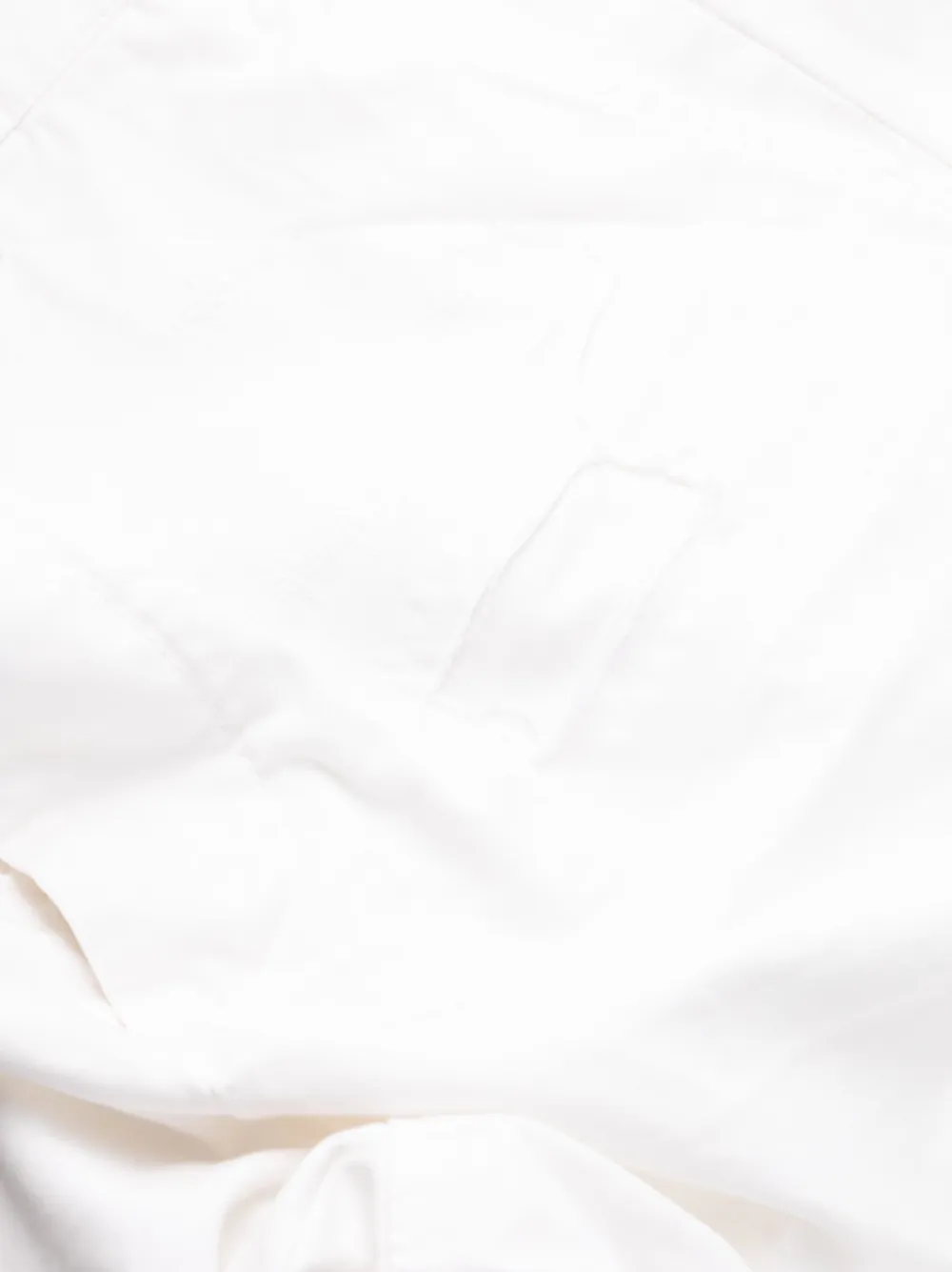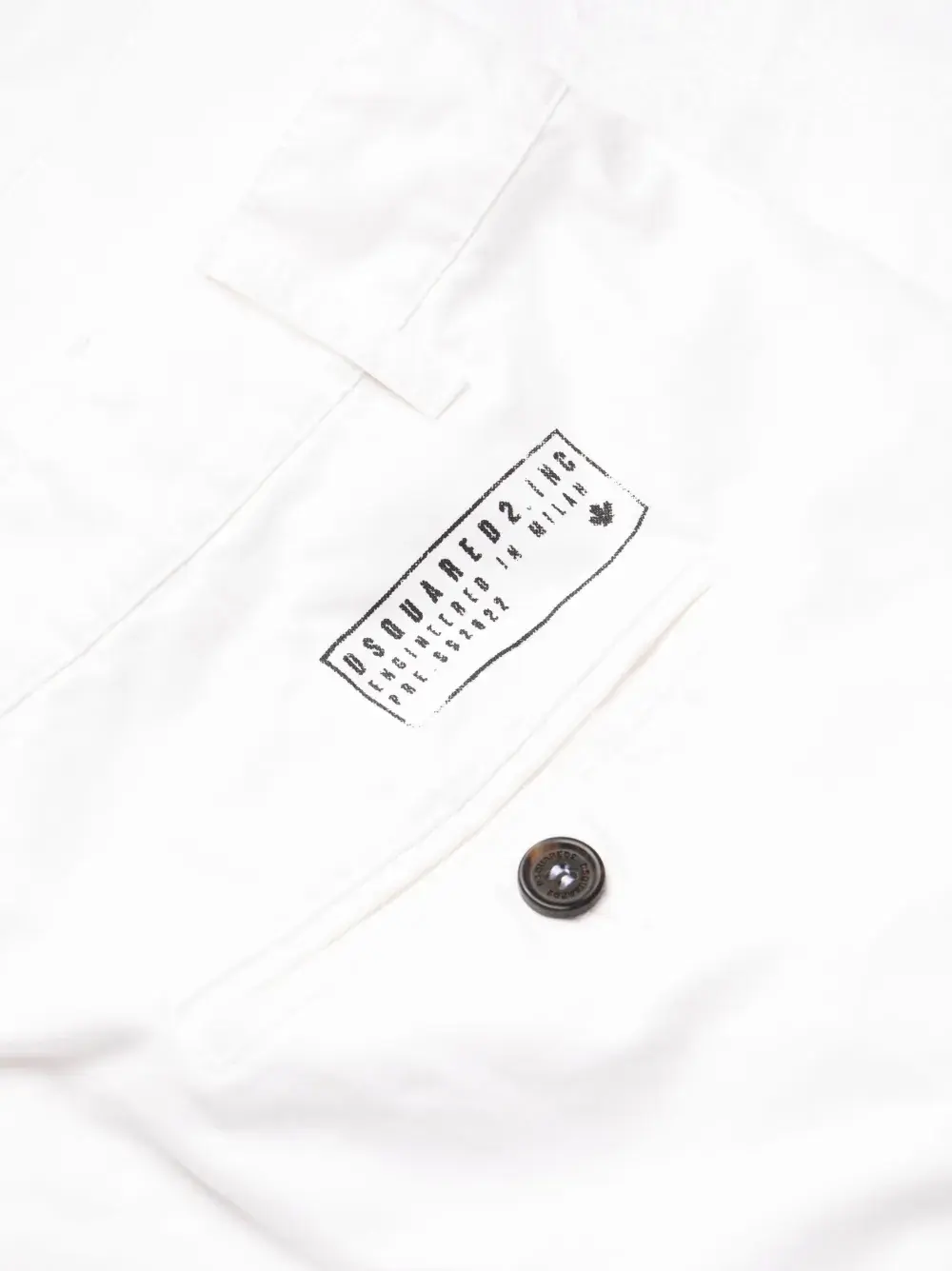 Белый, хлопок, принт с логотипом сзади, петли для ремня, застежка на молнии и пуговице спереди, два прорезных кармана по бокам, два прорезных кармана на пуговицах сзади и прямой крой.