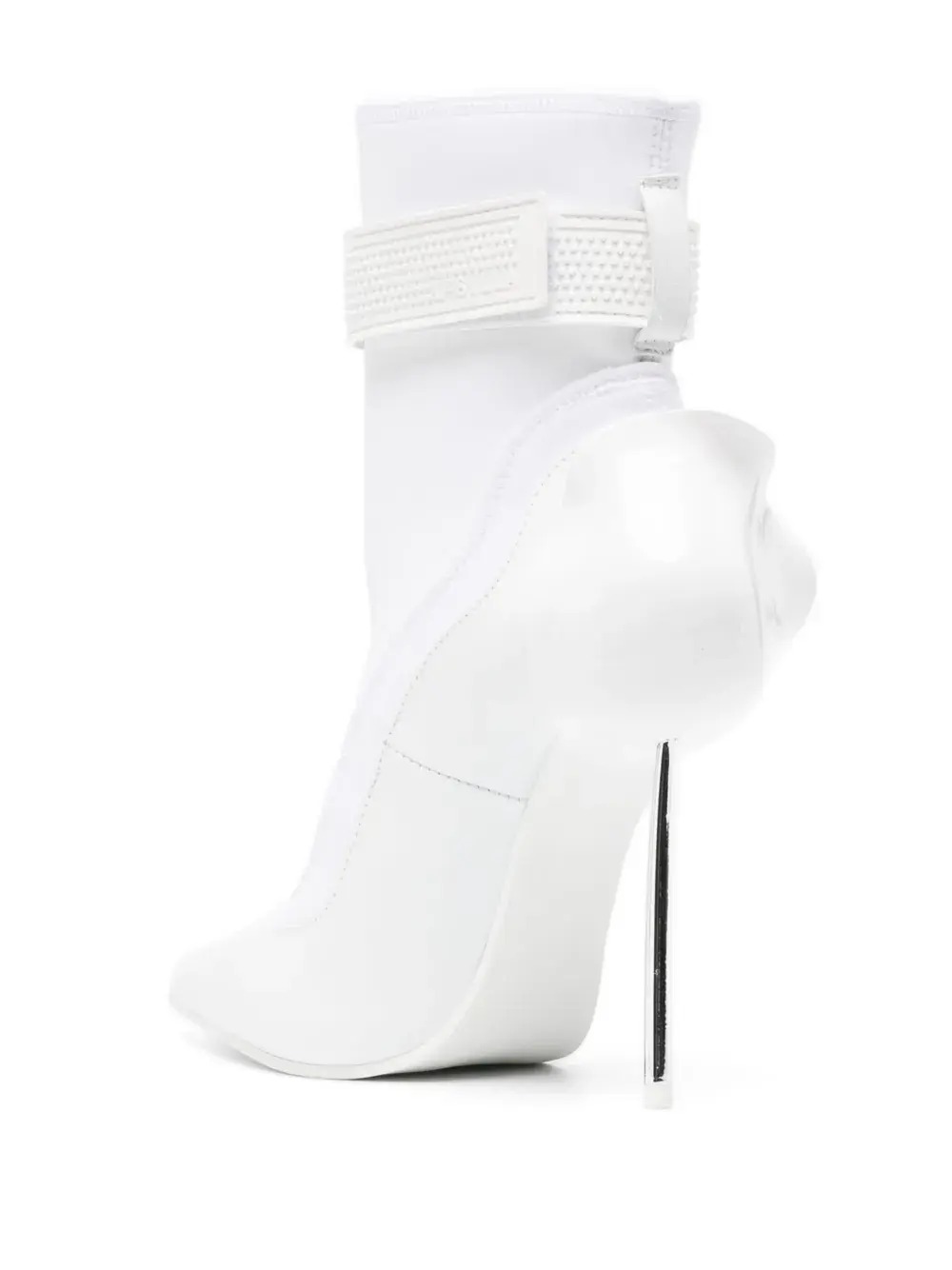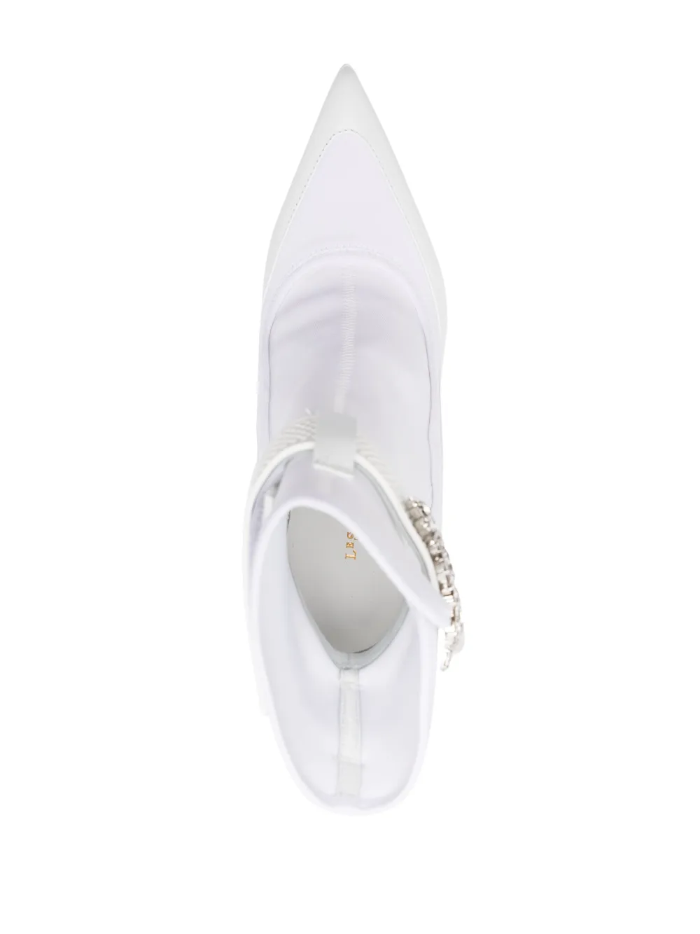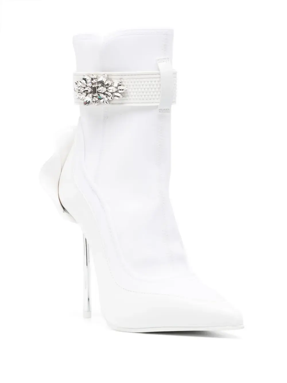 Белый, строчка в тон, декор из кристаллов, ремешки, заостренный носок, стелька с логотипом, каблук-шпилька и высота по щиколотку.