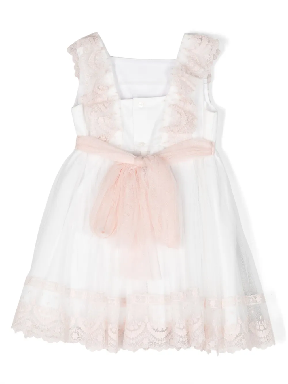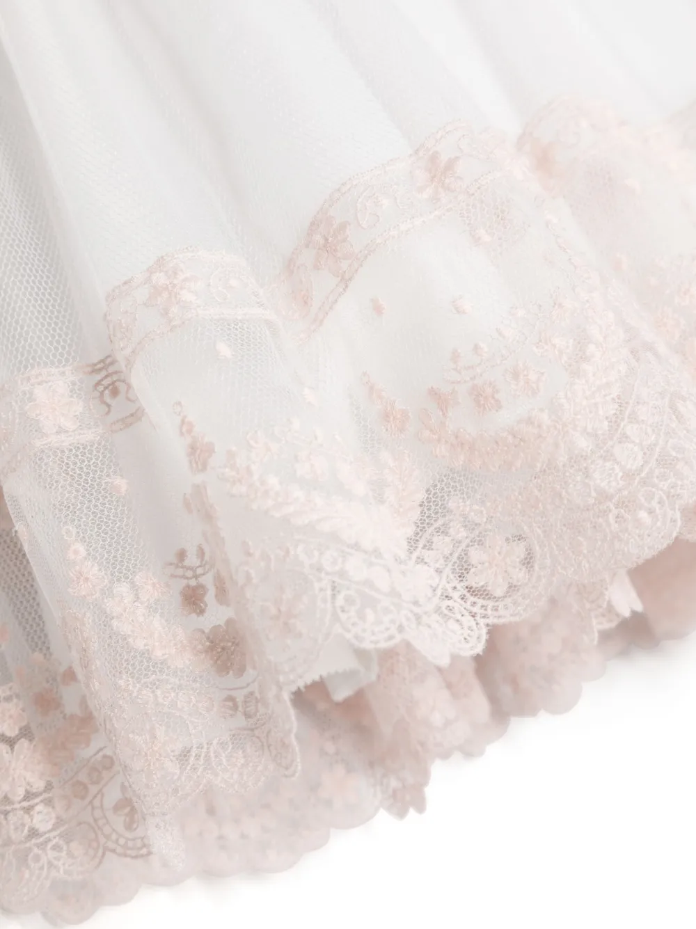 Белый, пудрово-розовый, сетчатый тюль, верхний слой из тюля, вставки из кружева, ремень на талии, цветочная аппликация, квадратный вырез, широкие бретели, без рукавов и расклешенная юбка.
