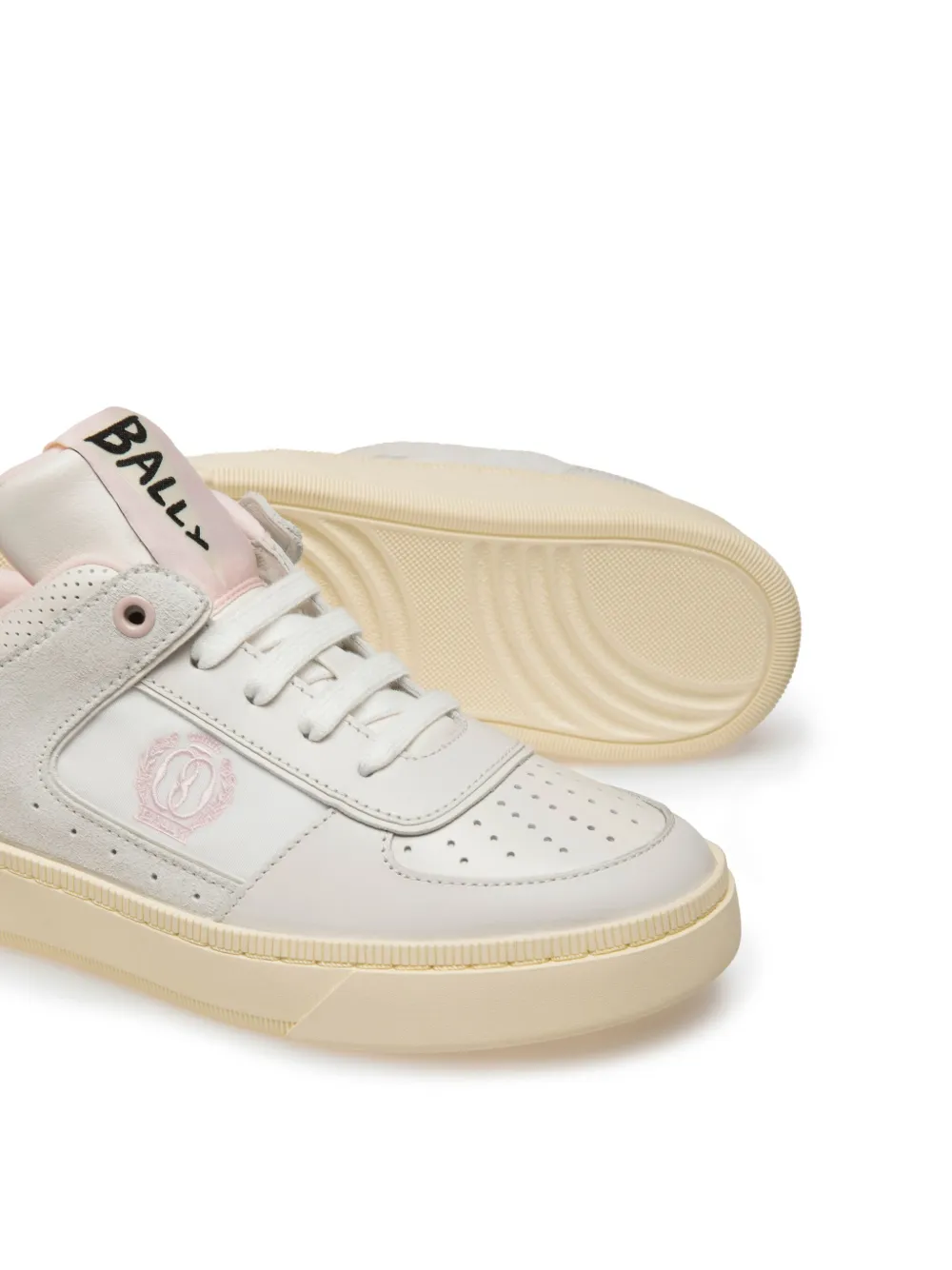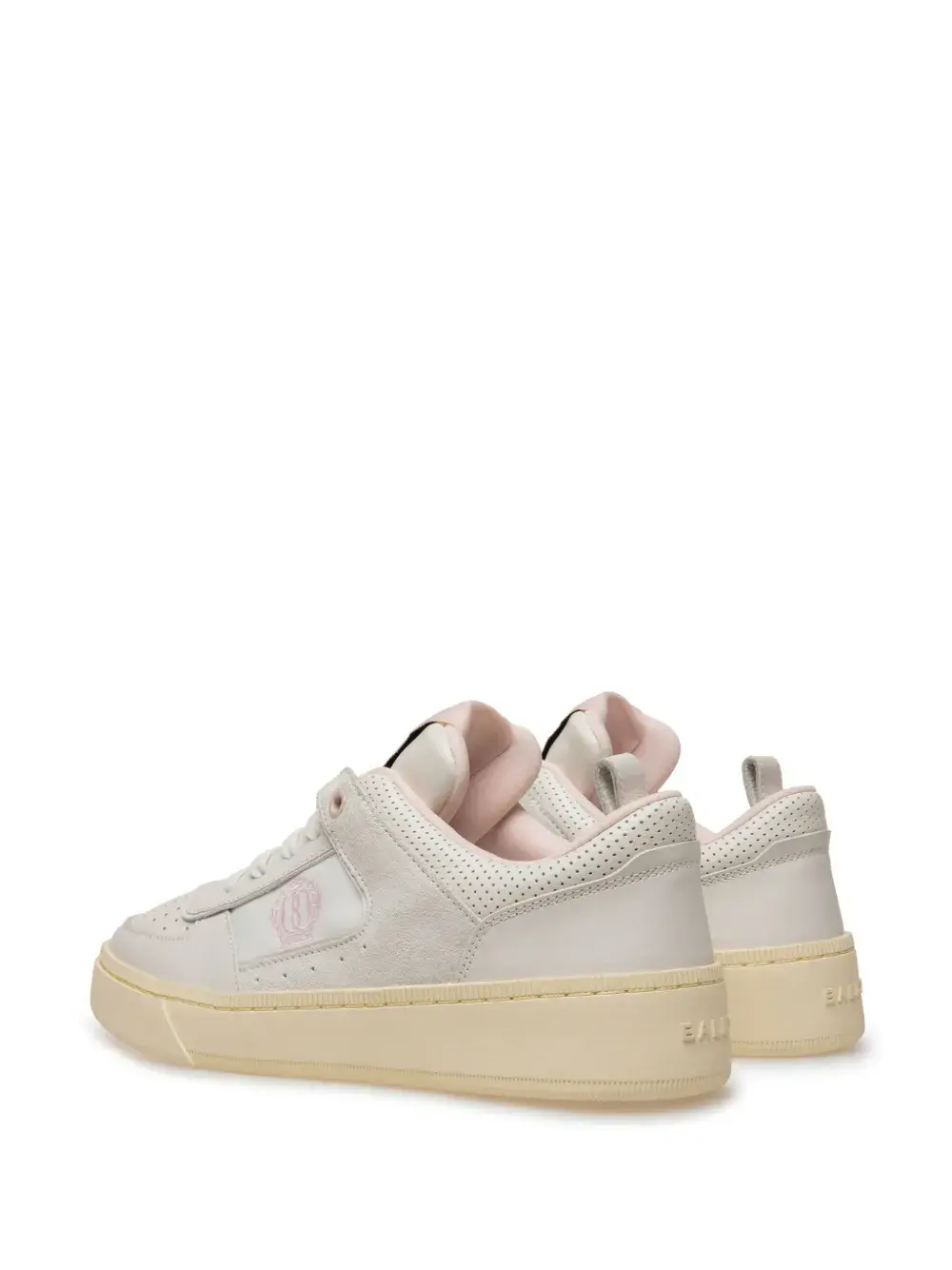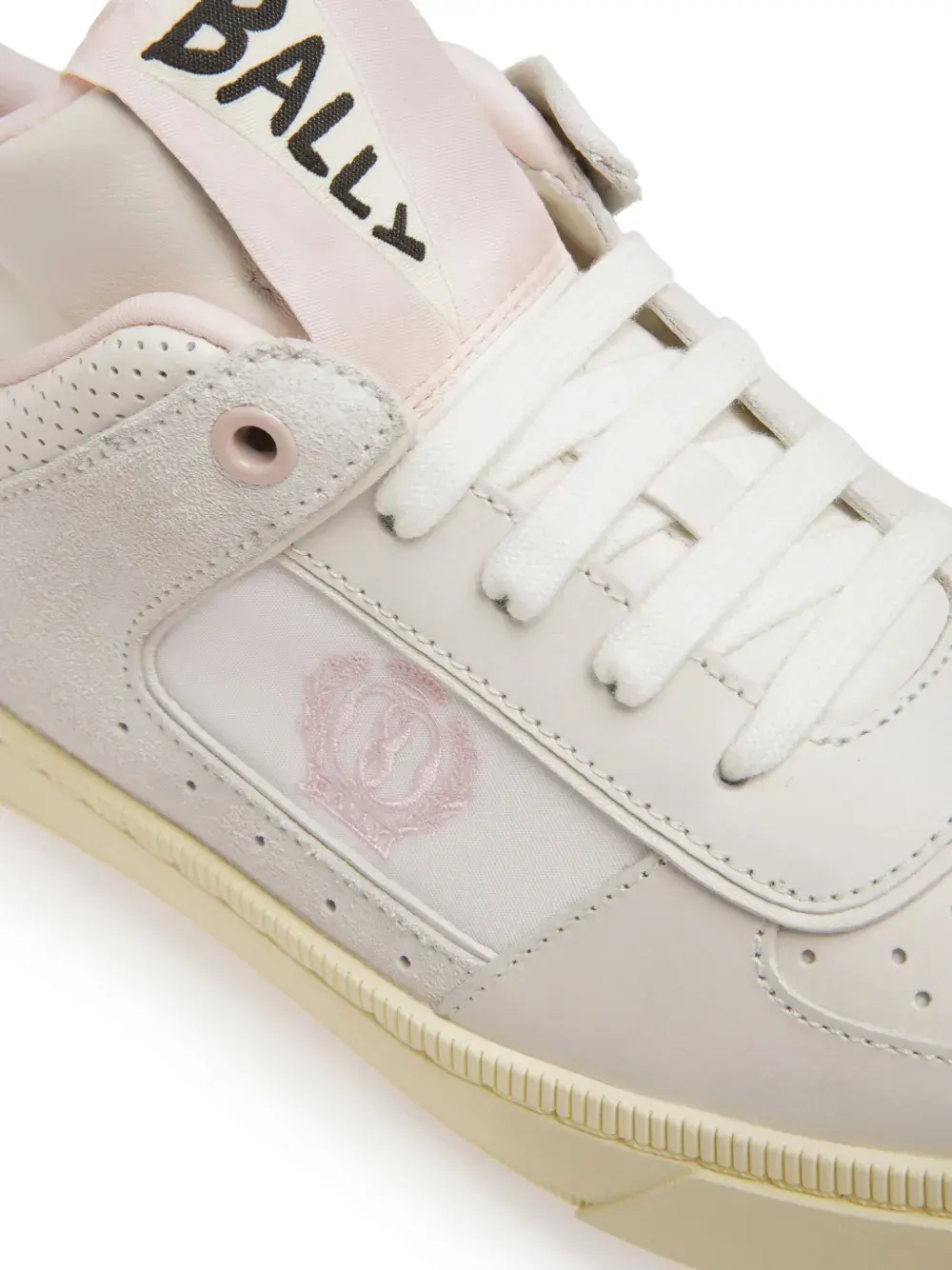 Белый, светло-розовый, телячья кожа, перфорация, логотип сбоку, закругленный носок, язычок с логотипом, закругленный носок, шнуровка спереди и плоская резиновая подошва.