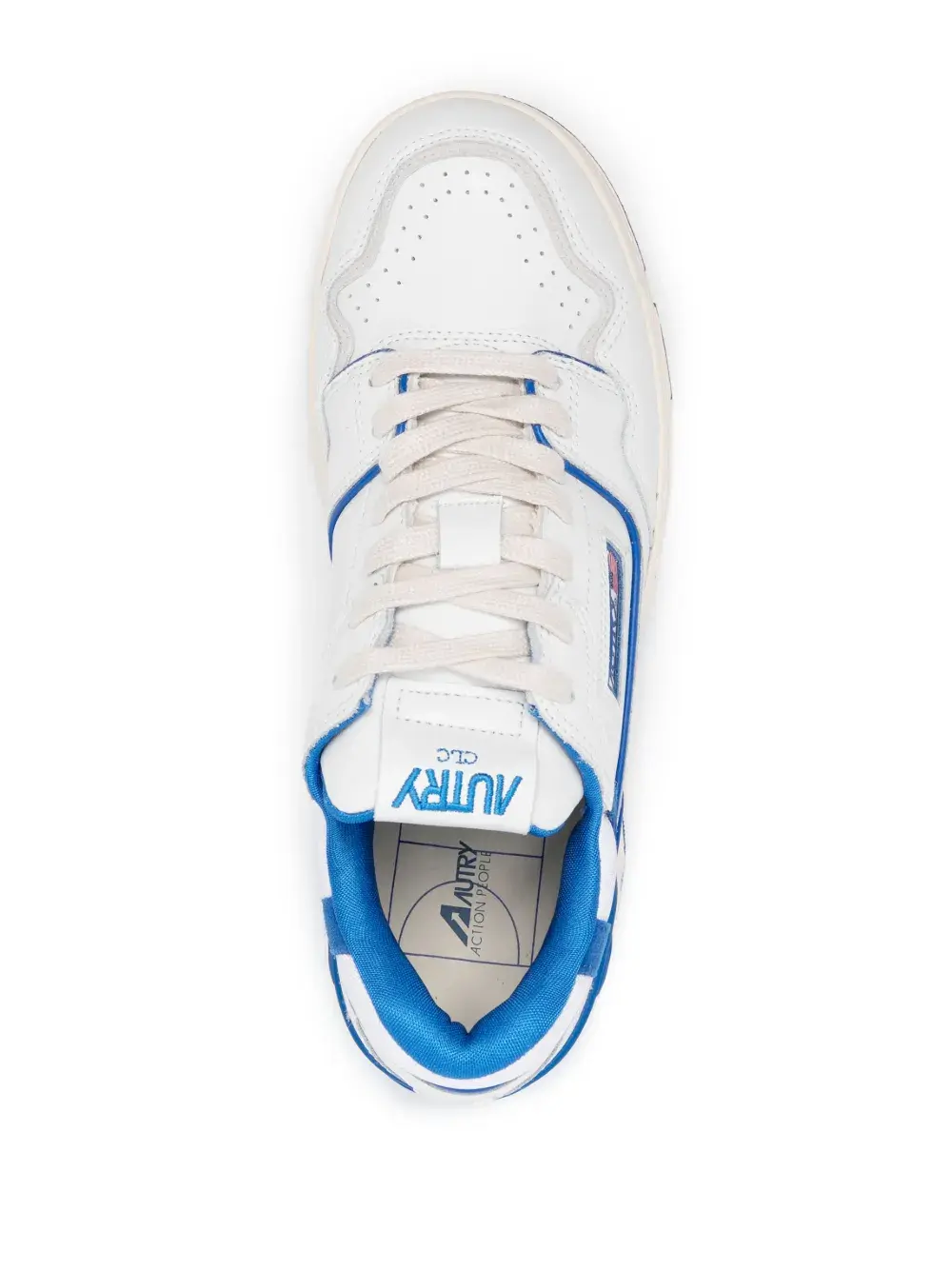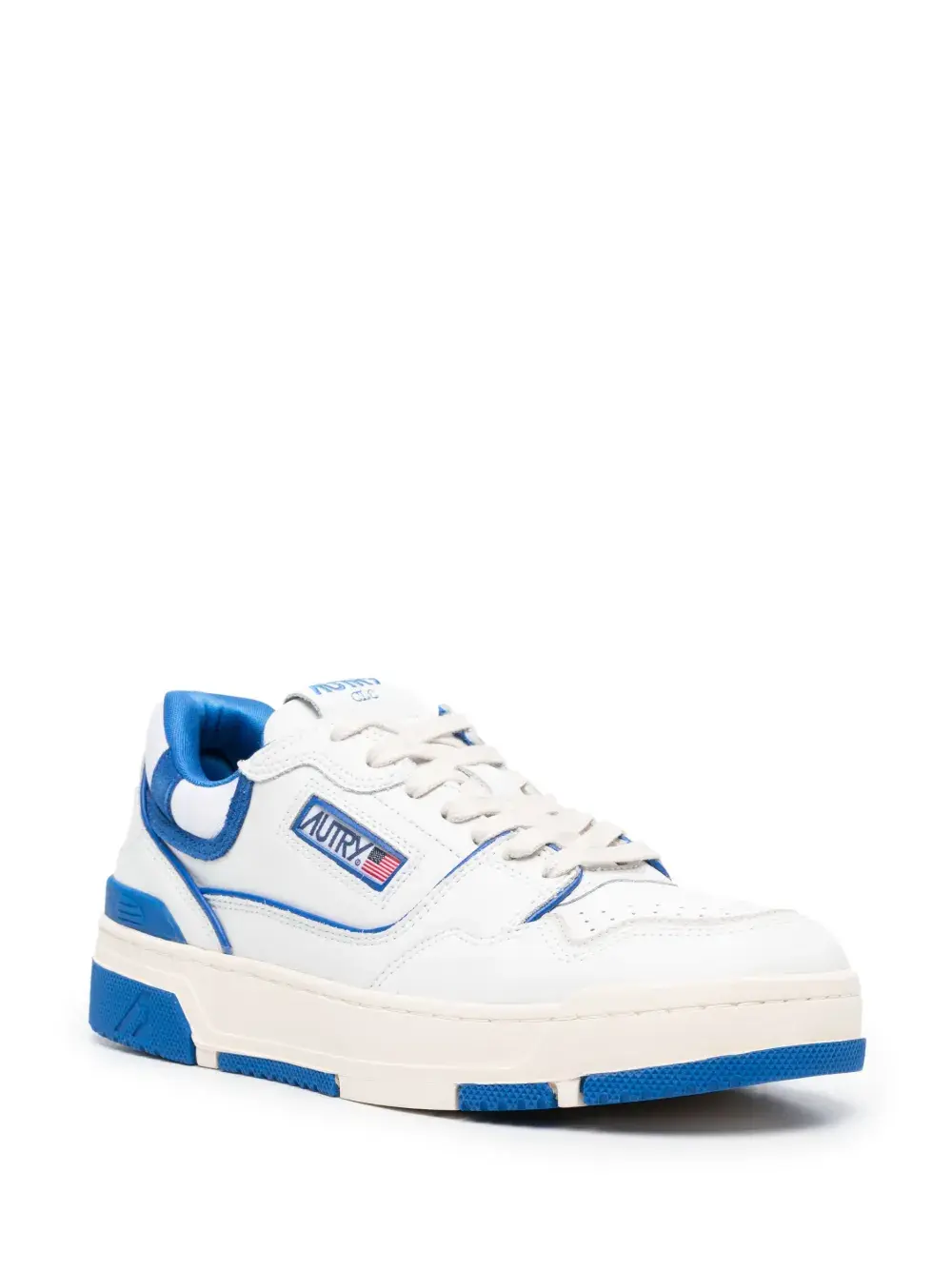 Белый, синий, телячья кожа, гладкая текстура кожи, вставки, тисненый логотип сзади, нашивка с логотипом на язычке, вышитый логотип сбоку, перфорированный носок, стелька с логотипом, закругленный носок, шнуровка спереди и плоская резиновая подошва.