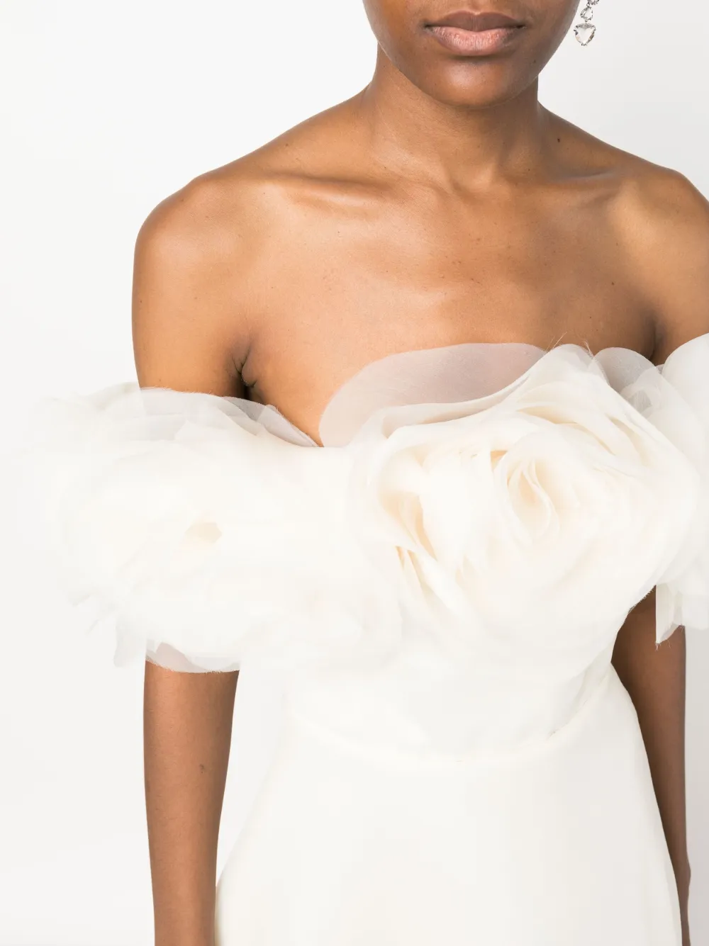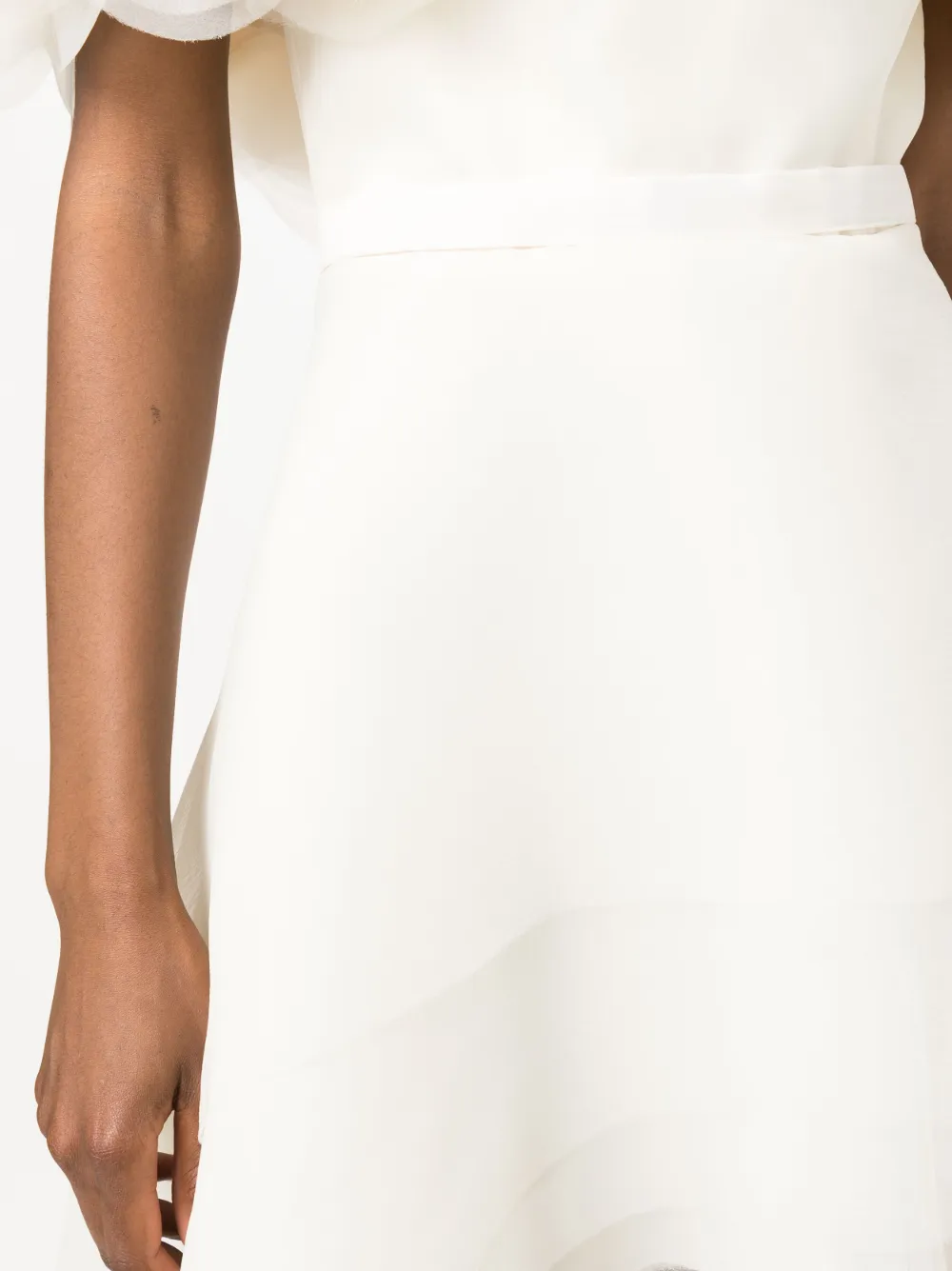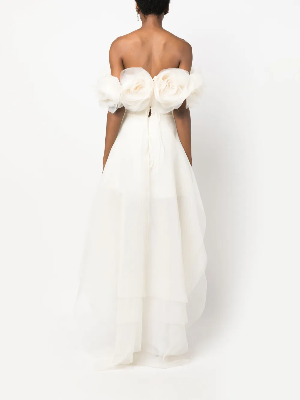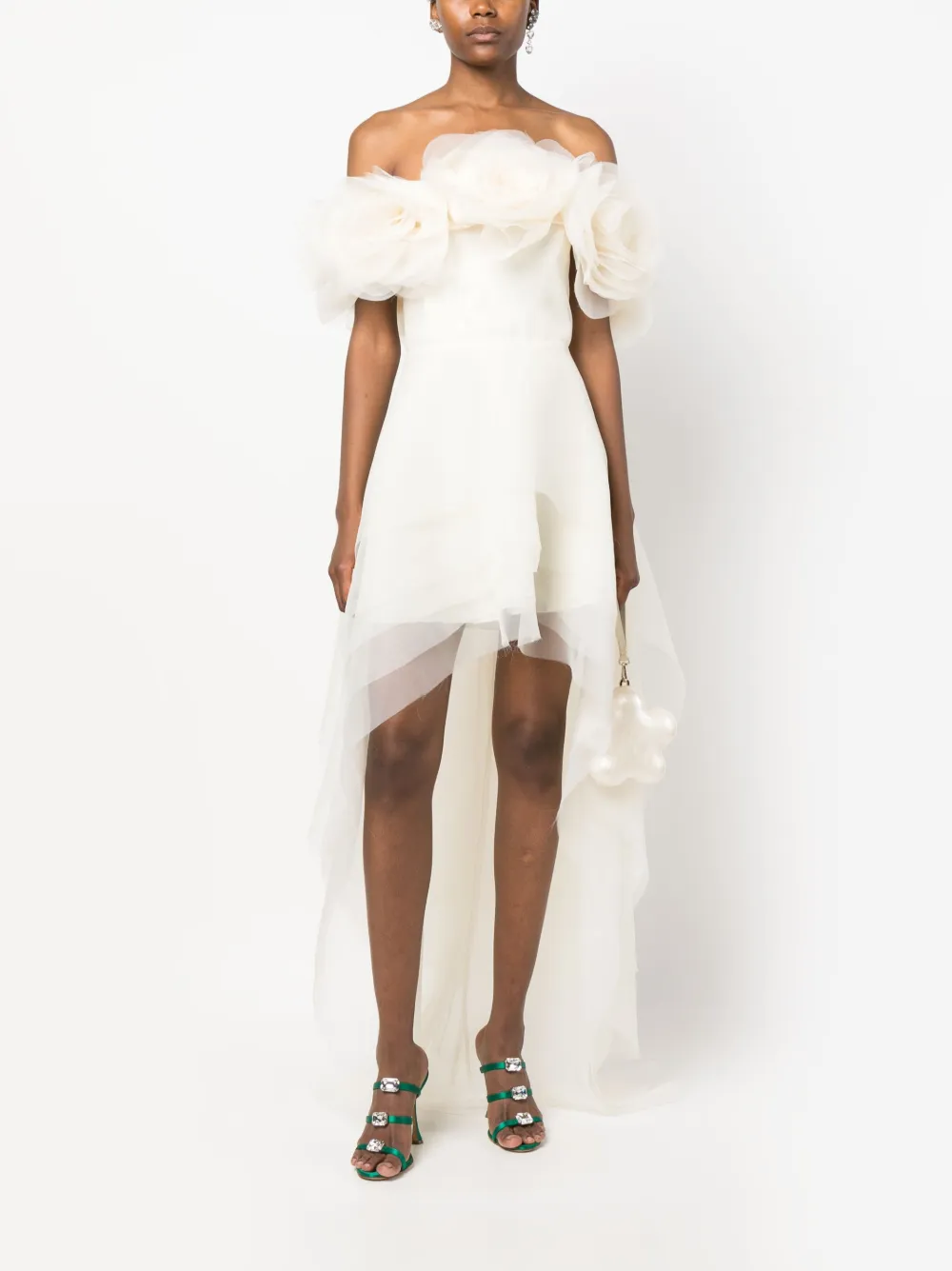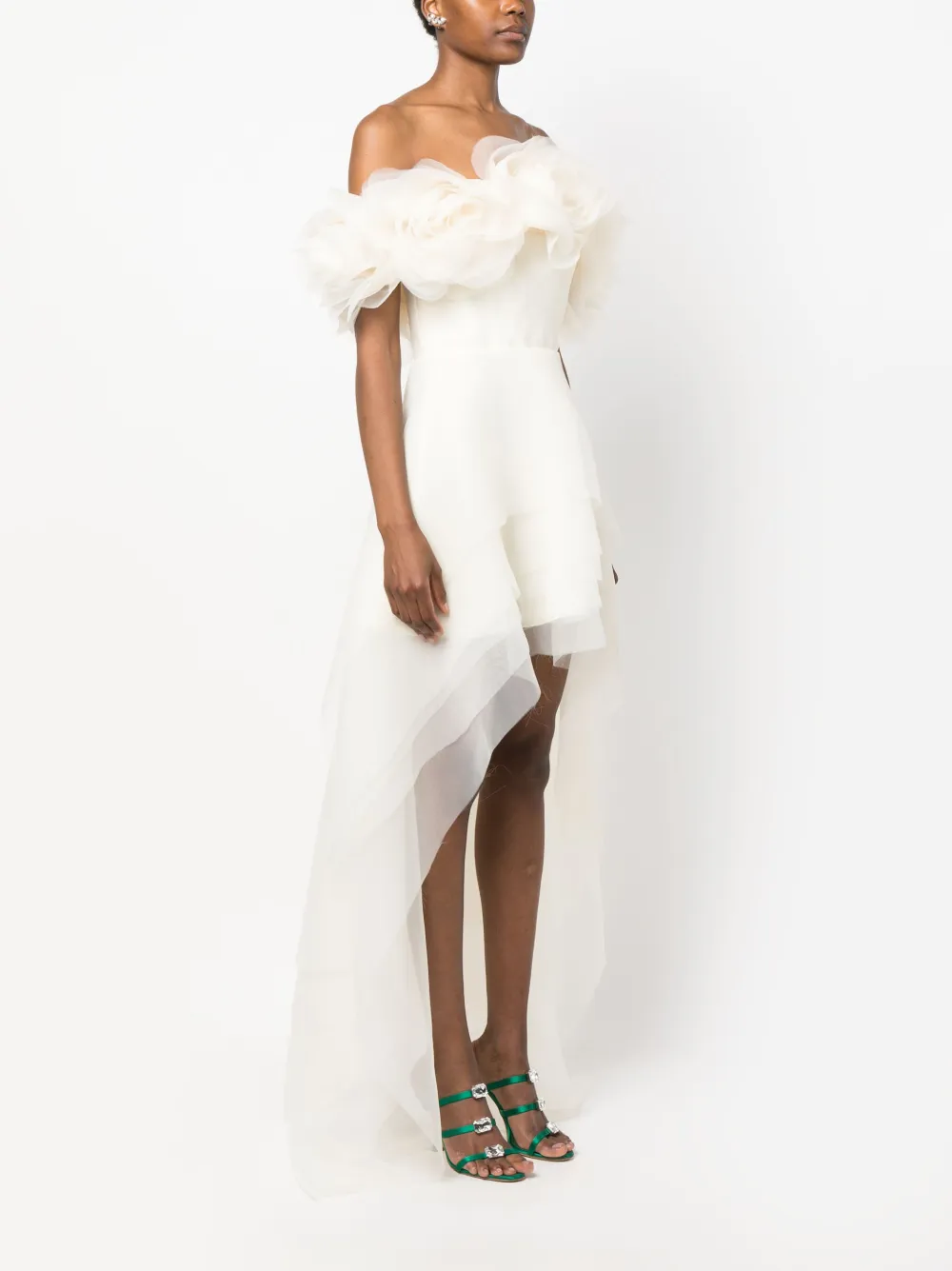 Белый, органза, многослойный дизайн, цветочная аппликация, вставки с оборками и асимметричный подол.