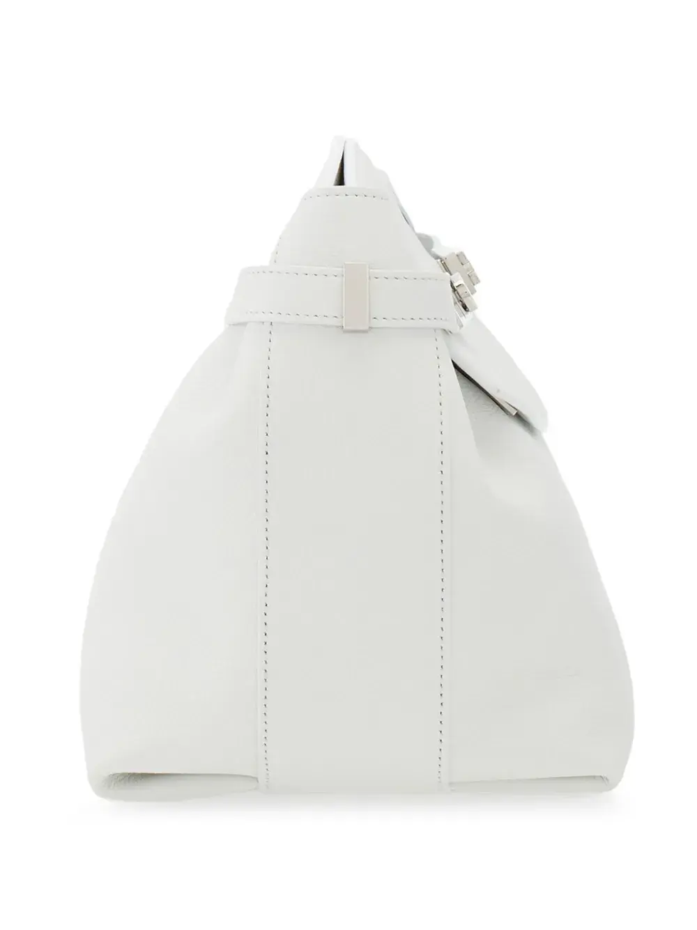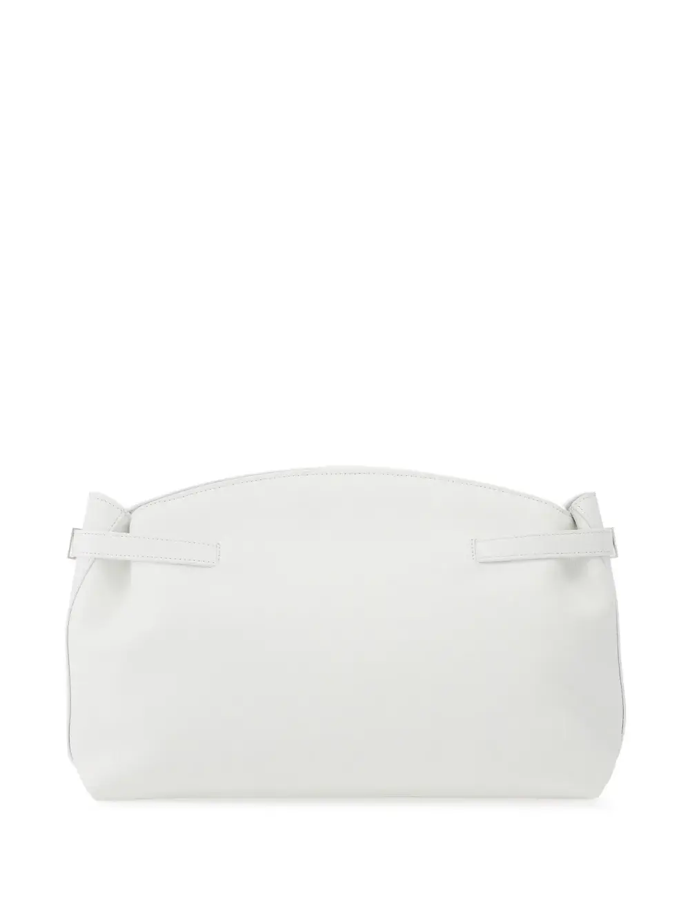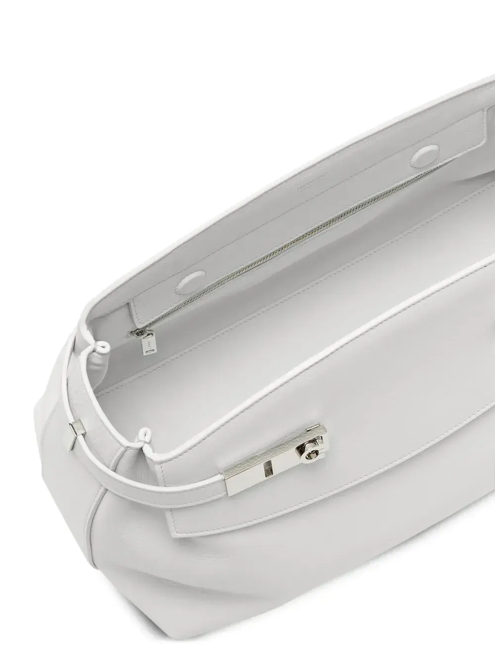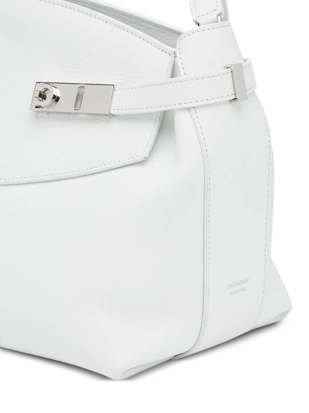 Белый, кожа, зернистая текстура, серебристая фурнитура, пряжка Gancini, потайная застежка на магните, застежка на молнии сверху и основное отделение.