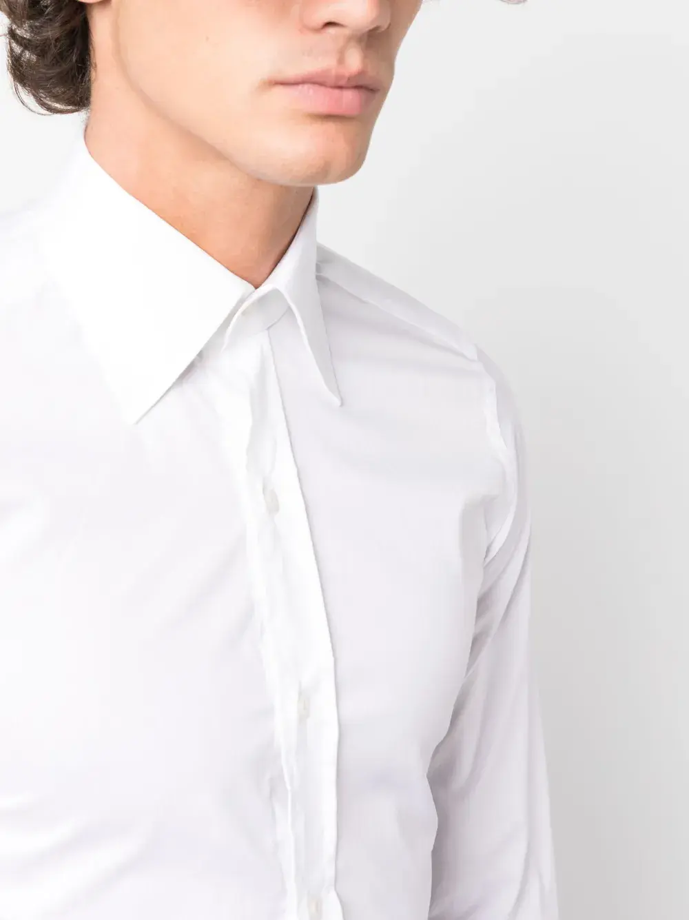Белый, хлопок, плоский заостренный воротник, планка на пуговицах спереди, длинные рукава, манжеты на пуговицах и закругленный подол сзади.