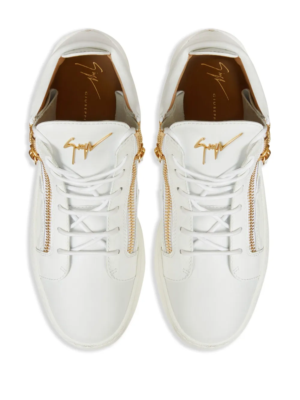 Белый, кожа, металлический логотип на язычке, шнуровка спереди, застежка на молнии спереди, закругленный носок, стелька с логотипом и плоская резиновая подошва.