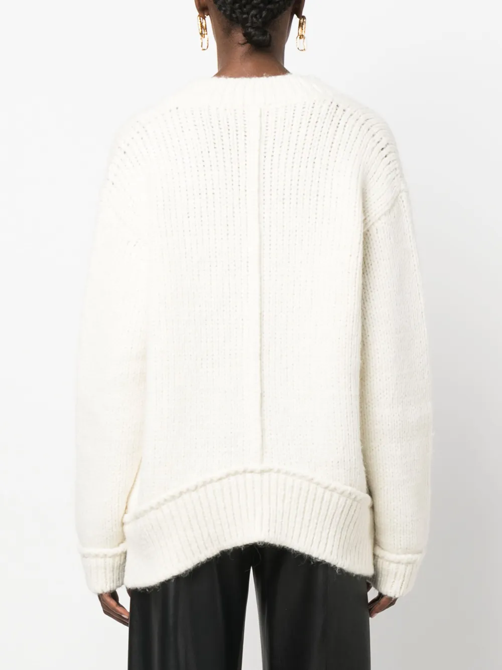 Серовато-белый, смесовая шерсть альпаки, трикотажный материал, длинные рукава и прямой подол.