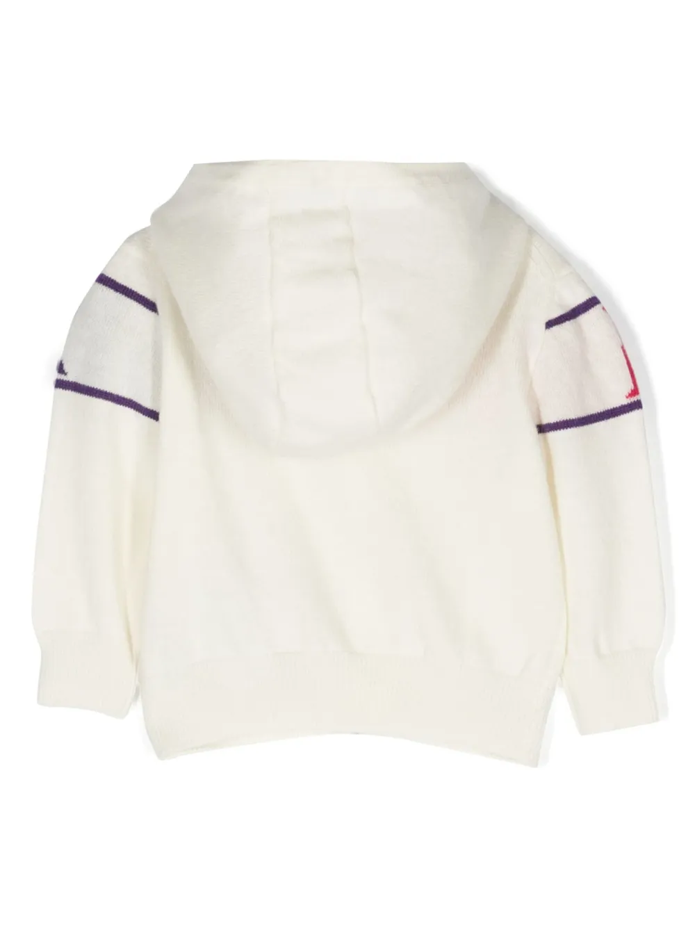 Кремово-белый, необработанная шерсть, трикотажный материал, логотип в технике интарсия, застежка на молнии спереди, длинные рукава и объемный капюшон.
