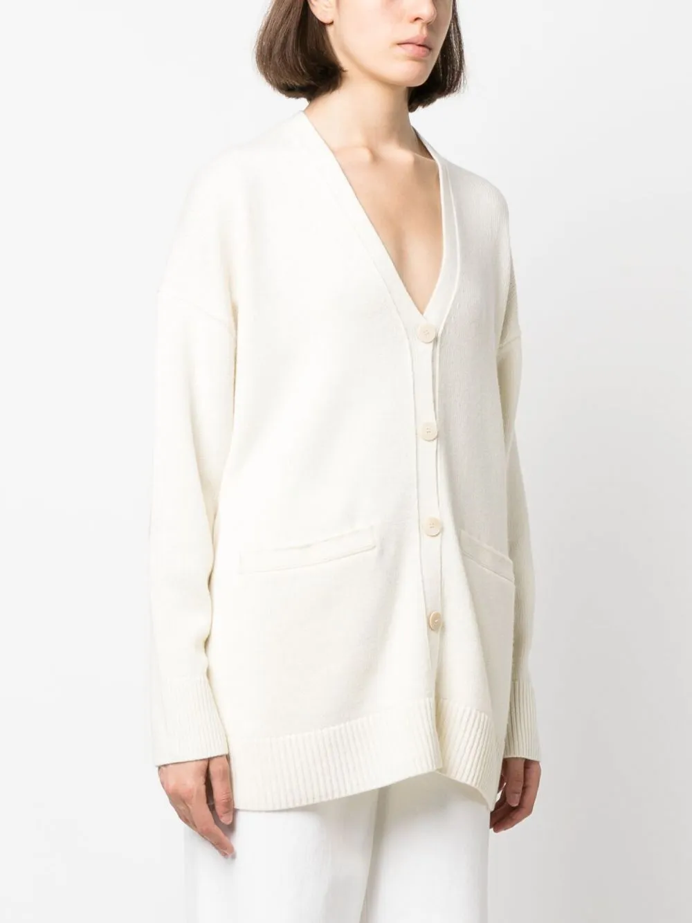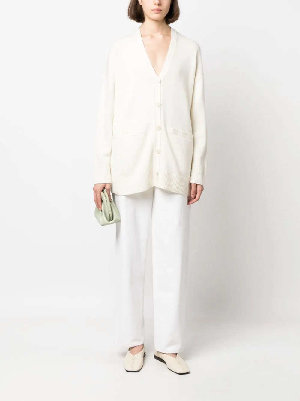 Цвет слоновой кости, овечья кожа, смесь шерсти и кашемира, тонкая вязка, заплатки на локтях, глубокий V-образный вырез, застежка на пуговицах спереди, длинные рукава и прямой подол.