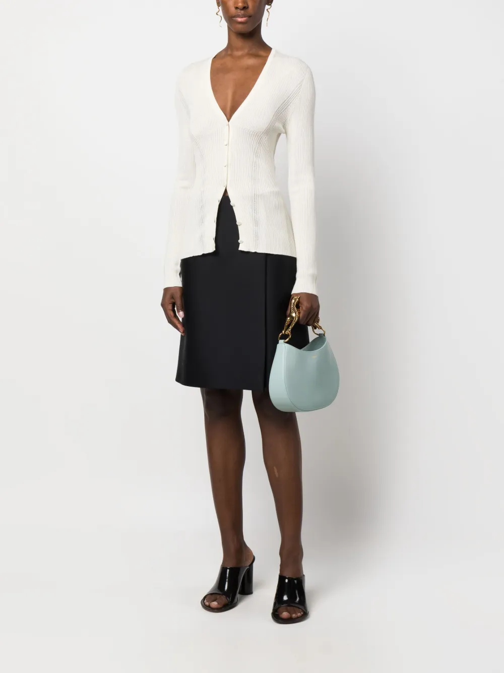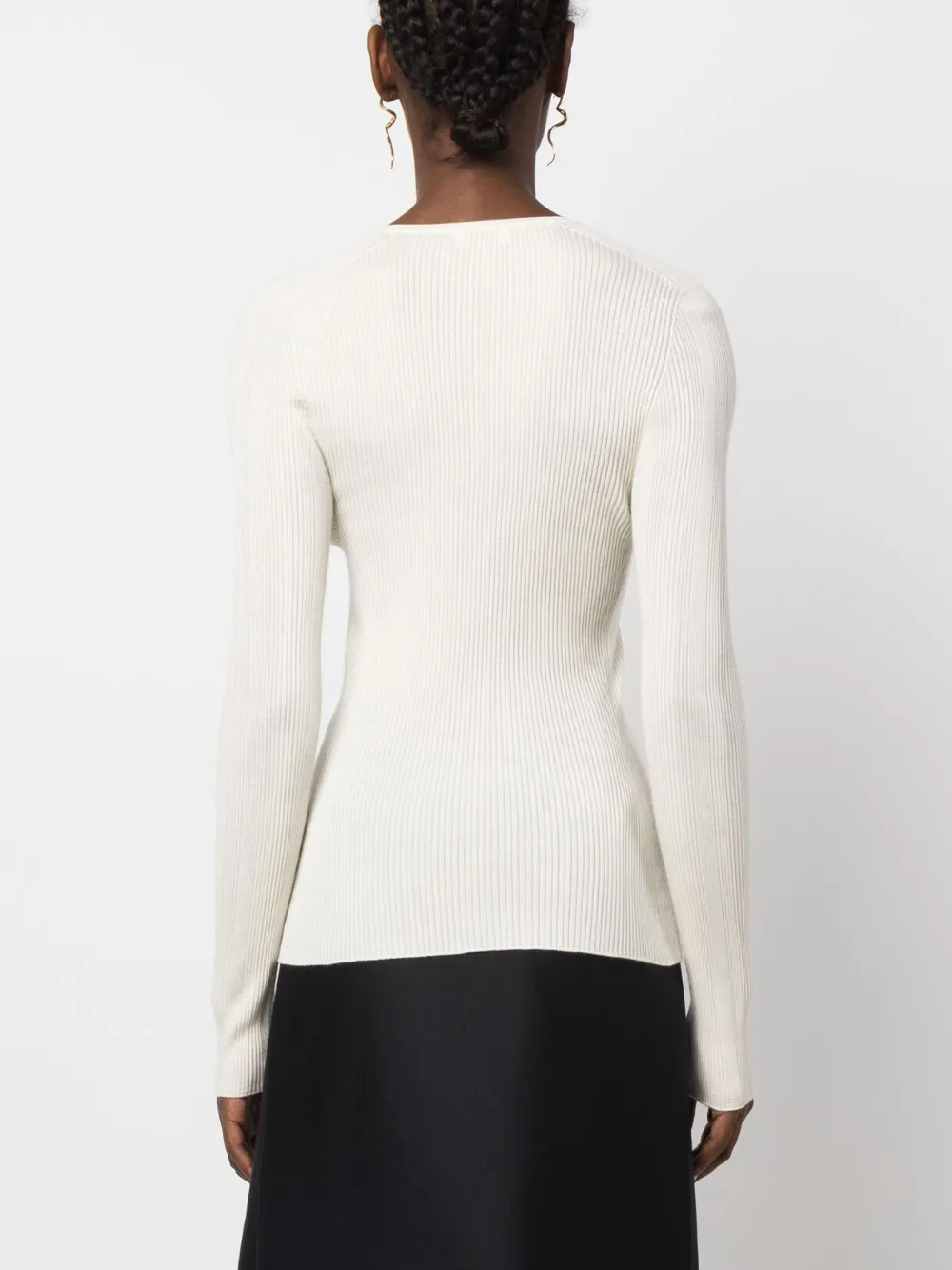Молочно-белый, смесь кашемира и шелка, трикотажный материал, V-образный вырез, длинные рукава, застежка на пуговицах спереди и прямой подол.