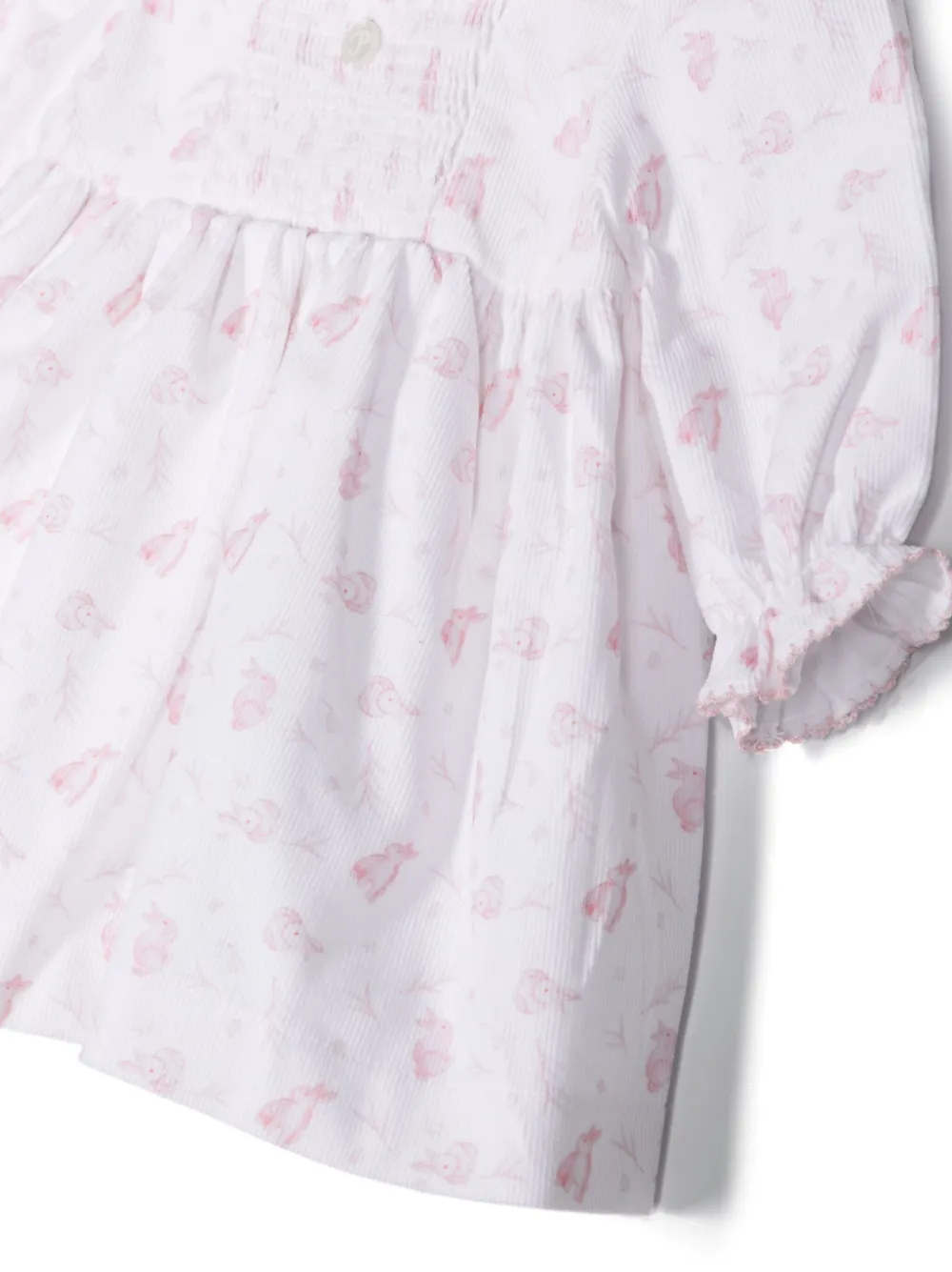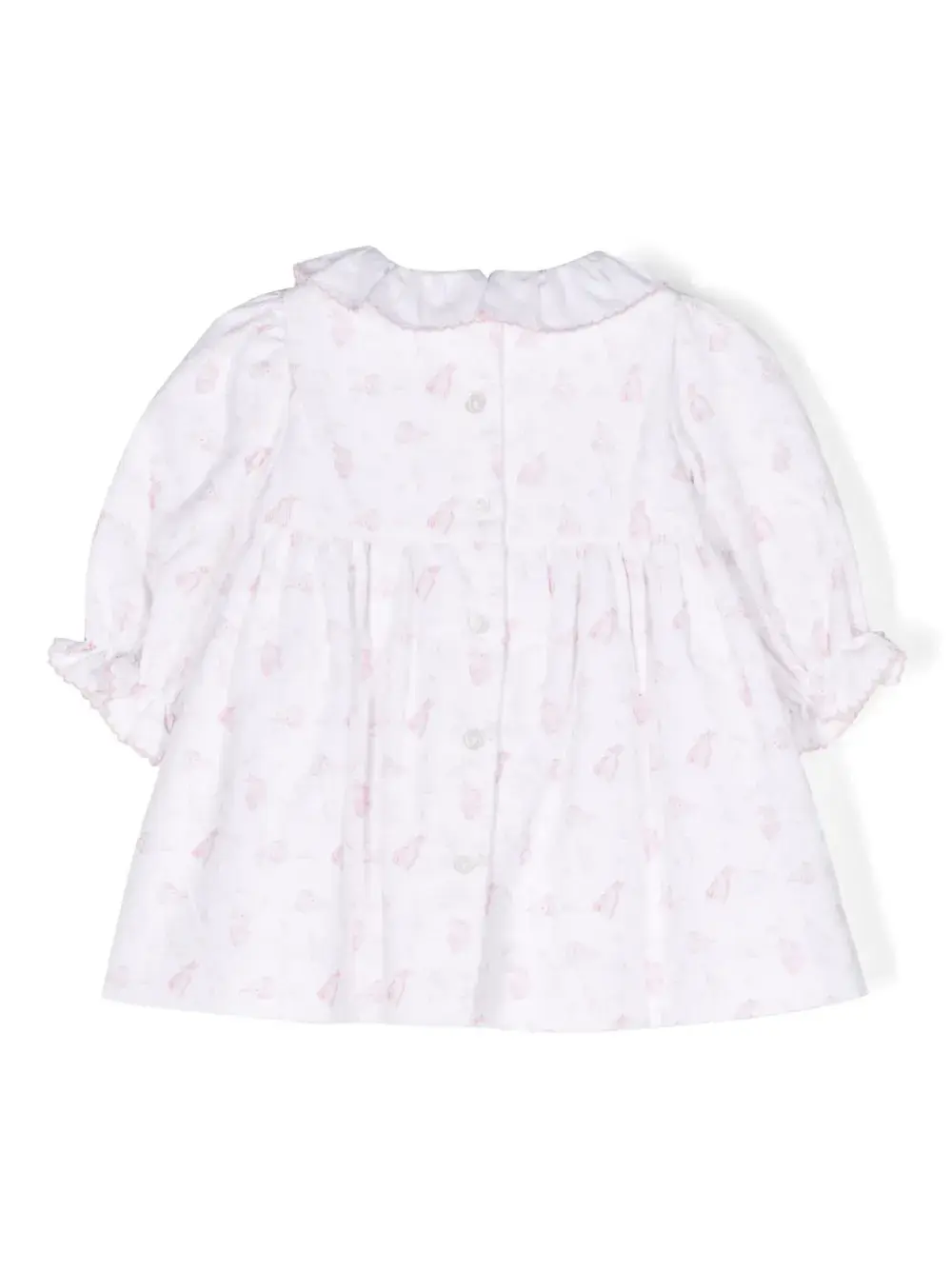 Расцветка Cloud White, хлопок, принт с узором, отделка со сборками, воротник с фестонами, застежка на пуговицы сзади, длинные рукава и расклешенный подол.