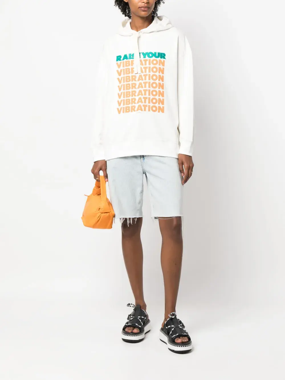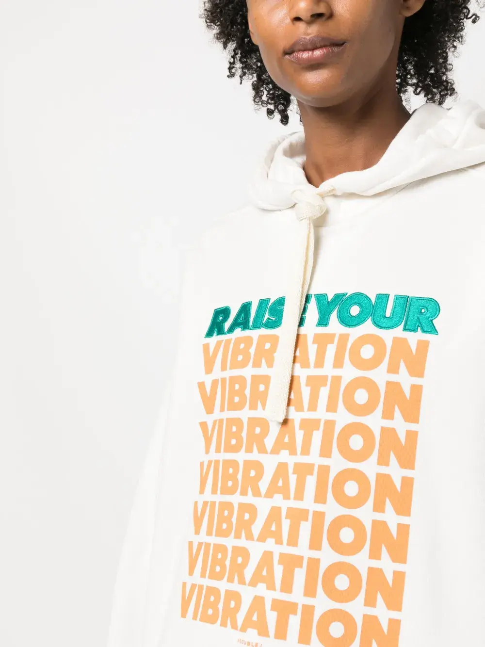 Кремовый, затягивающийся на шнурок капюшон, логотип спереди, длинные рукава и прямой подол.