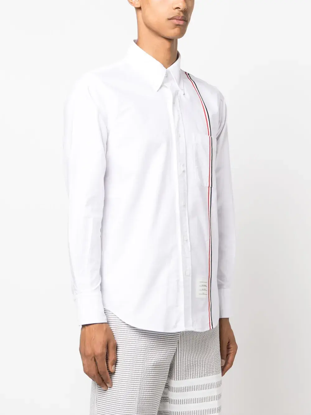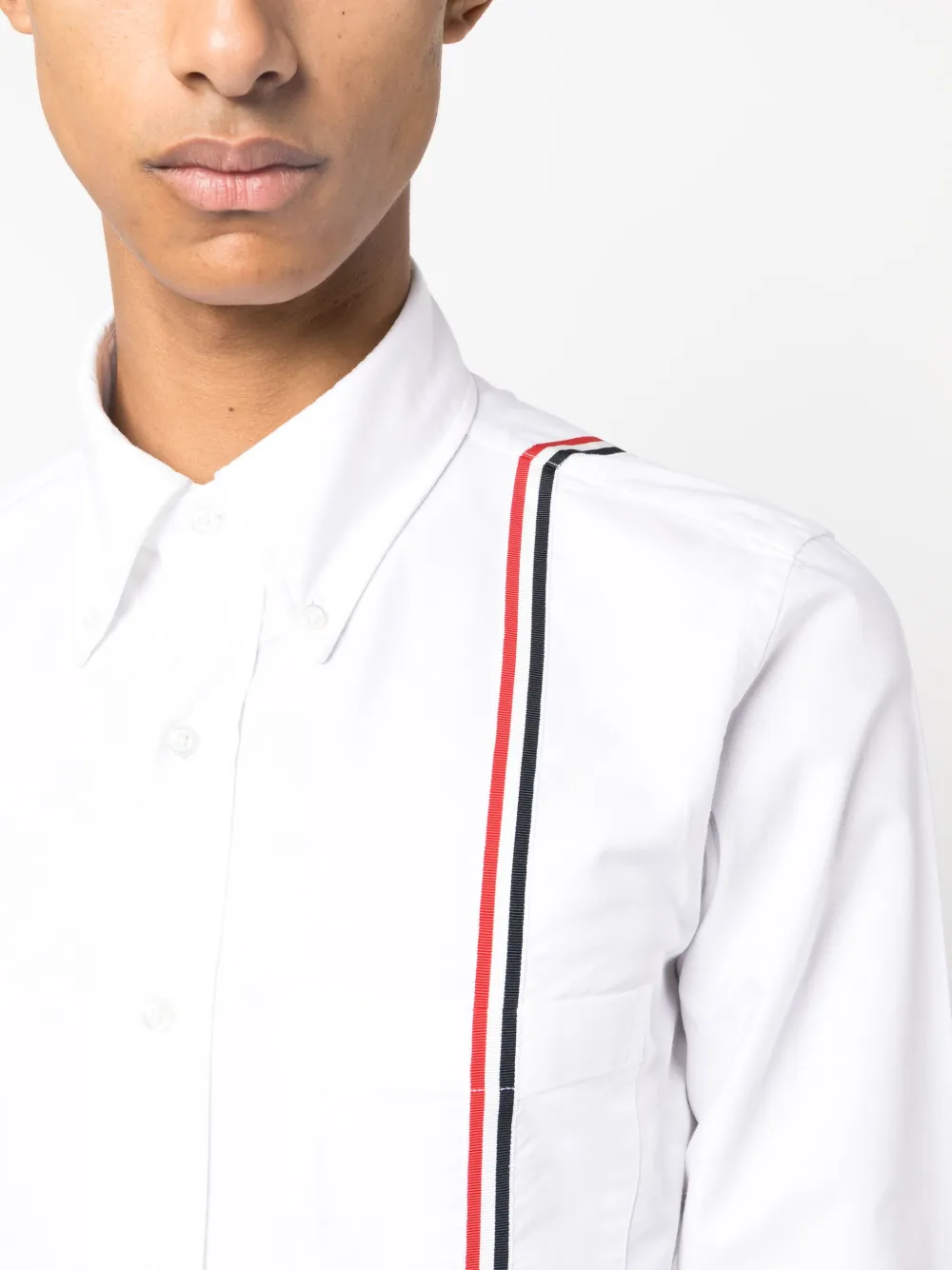 Белый, красный, темно-синий, хлопок, отделка корсажной лентой, полоски RWB, воротник на пуговицах, застежка на пуговицах спереди, нагрудный накладной карман, длинные рукава, манжеты на пуговицах и закругленный подол.