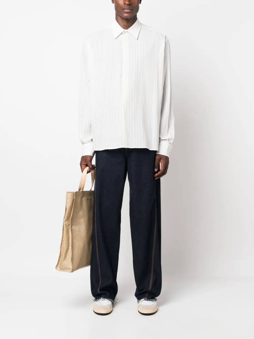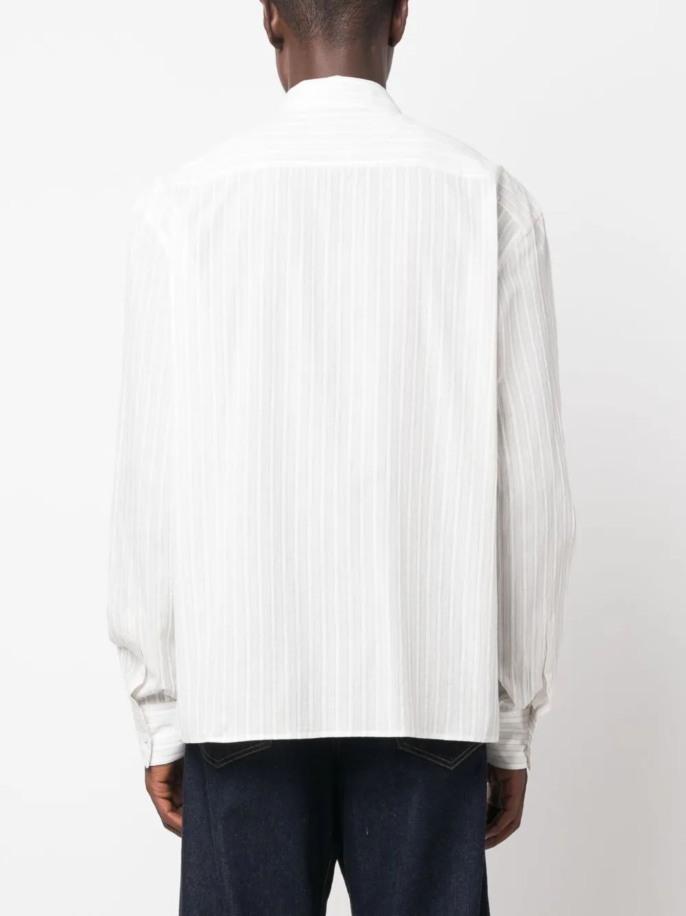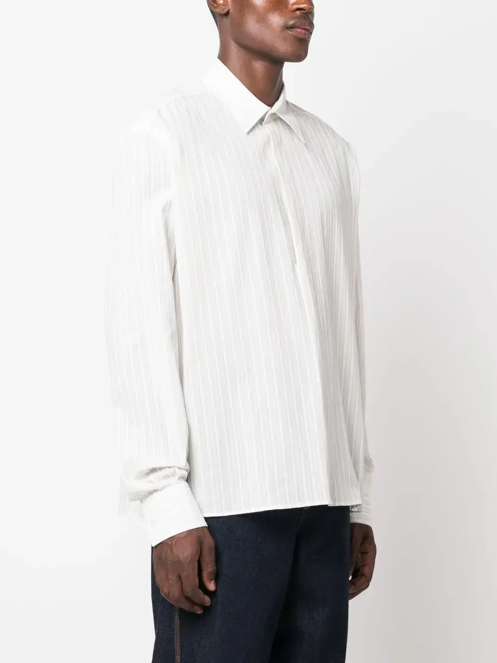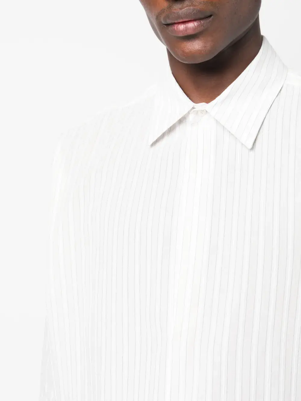 Белый, хлопок, принт в вертикальную полоску, классический воротник, застежка на пуговицах спереди, длинные рукава и прямой подол.