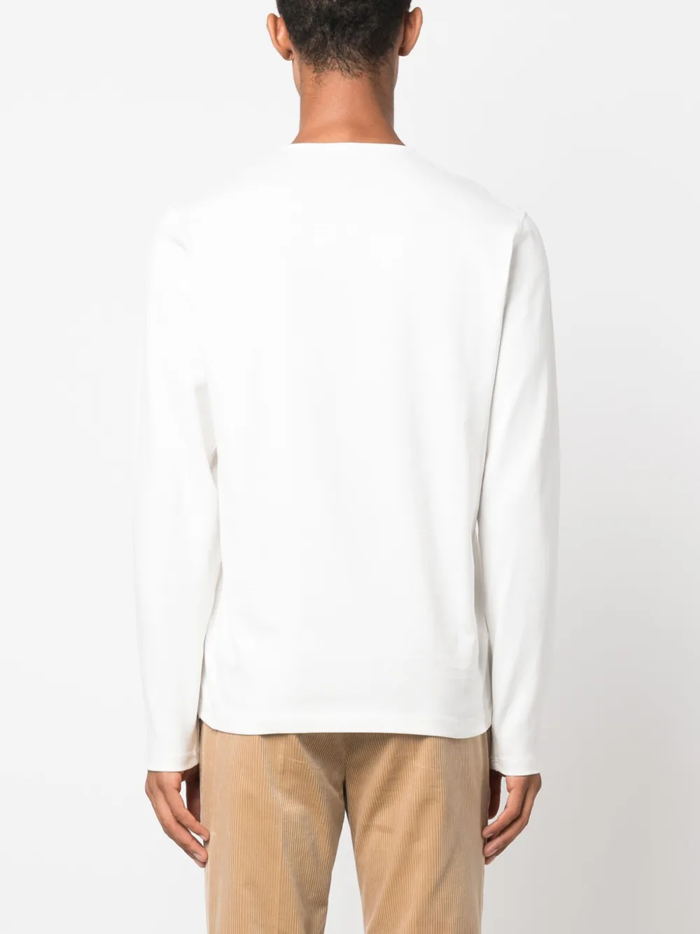 Белый, хлопок, круглый вырез, короткая застежка на пуговицах спереди, длинные рукава и прямой подол.
