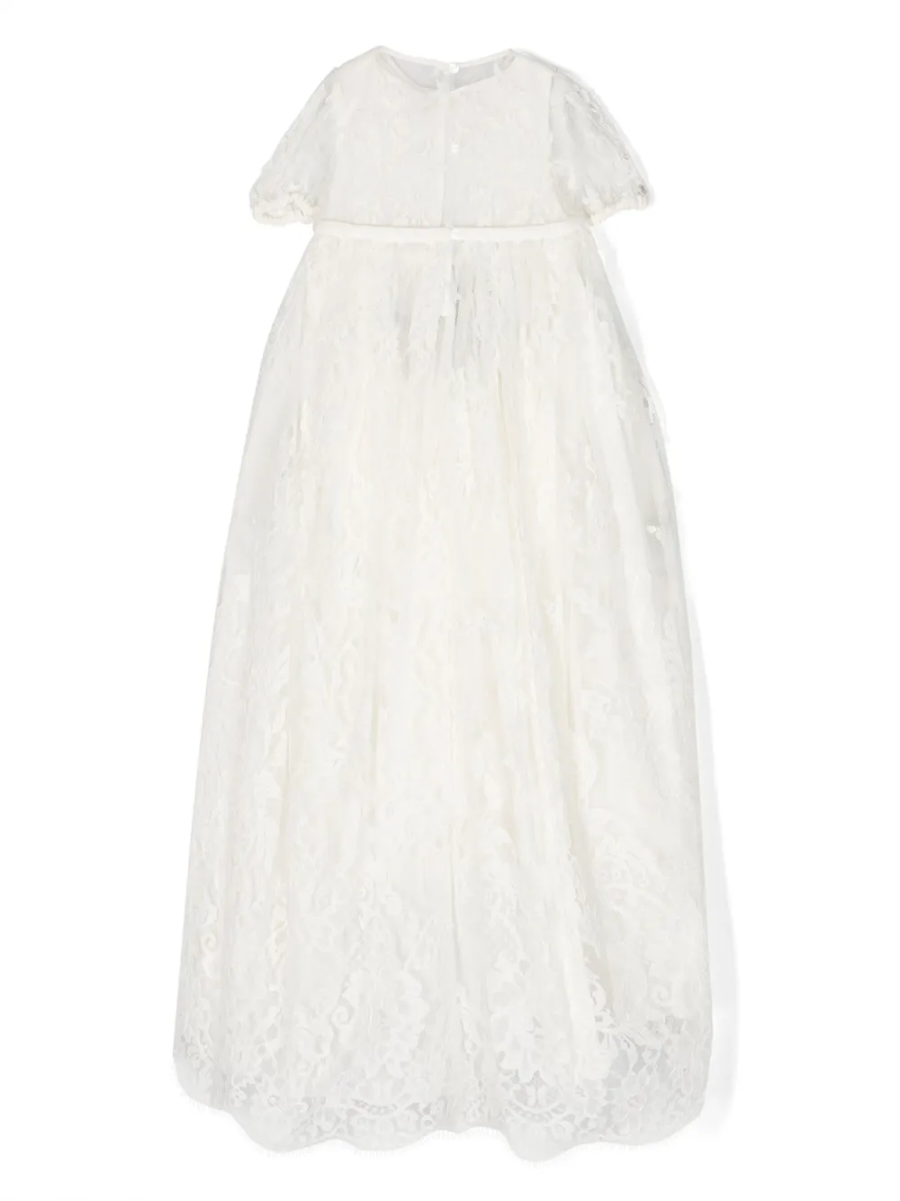 Кремовый, шелк, аппликация из кружева с цветочным узором, круглый вырез, короткие рукава и экстрадлинная модель.