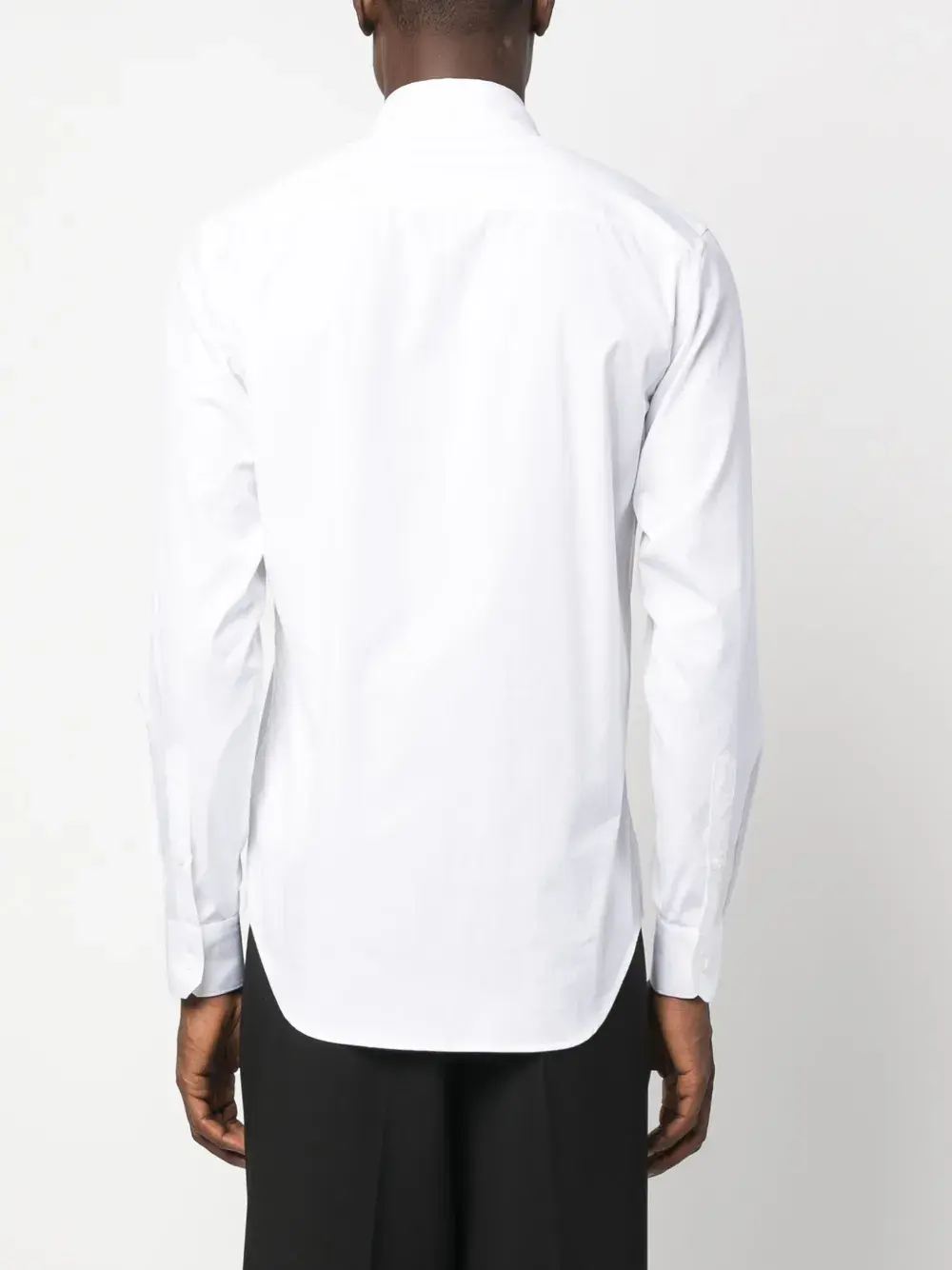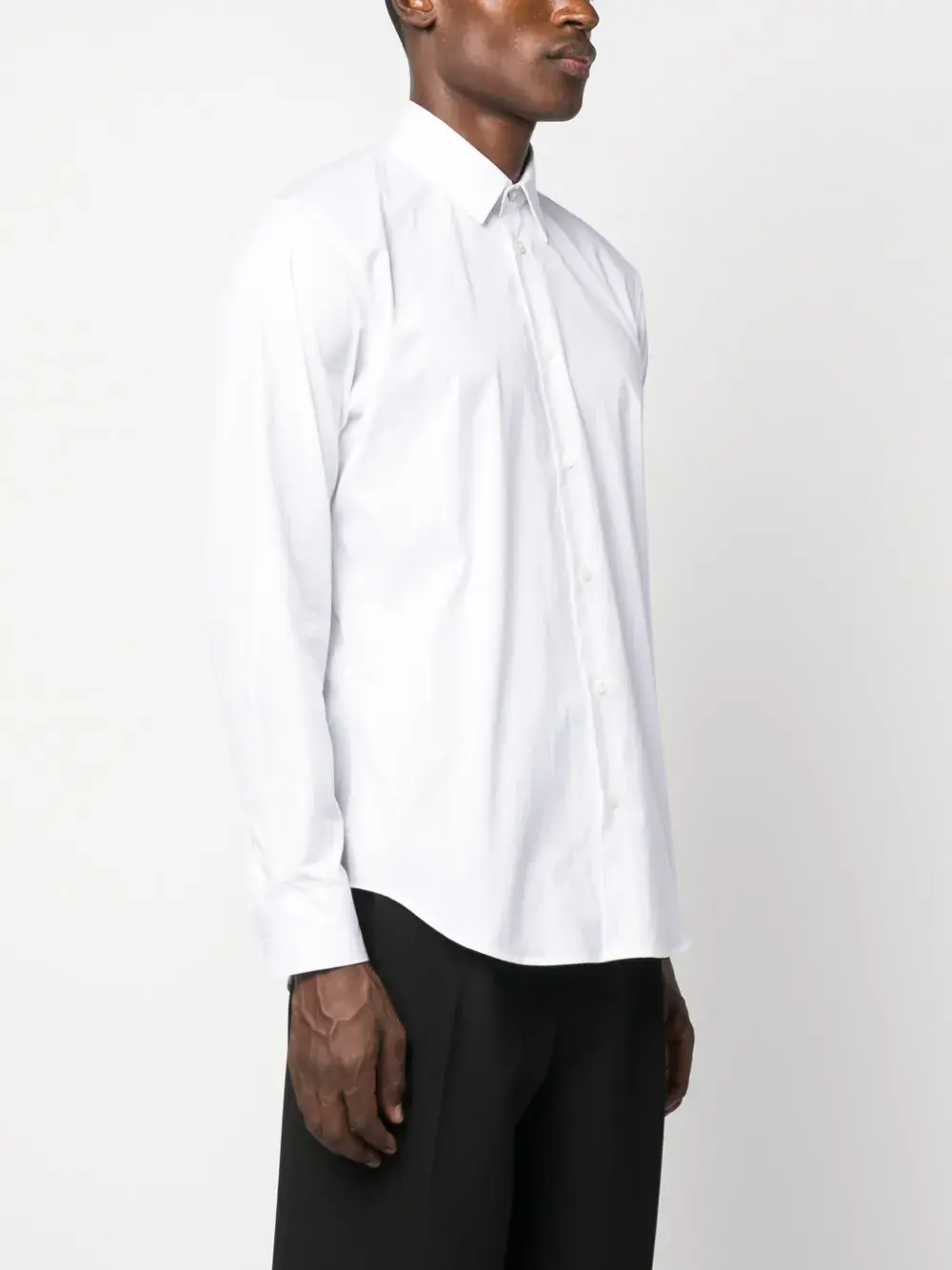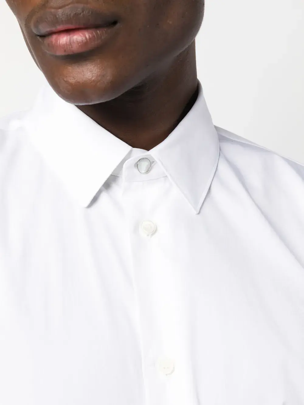 Белый, хлопок, поплин, классический воротник, планка на пуговицах спереди, длинные рукава, манжеты на пуговицах и закругленный подол.