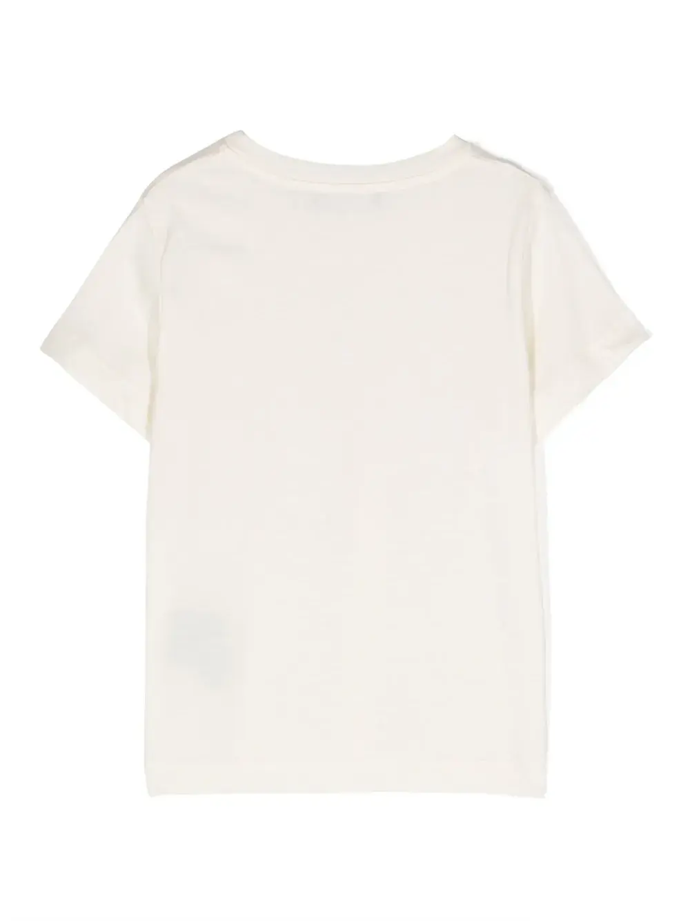 Кремовый, хлопок, украшения из горного хрусталя, тисненый логотип спереди, круглый вырез, короткие рукава и прямой подол.
