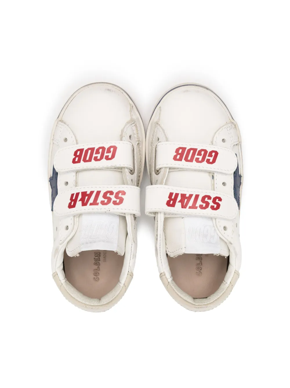 Красный/белый/синий, телячья кожа, ремешки с логотипом, нашивка с логотипом на язычке, нашивка в форме звезды сбоку, стелька с логотипом, принт с изображением смайла, закругленный носок, застежка на липучке спереди и плоская резиновая подошва.