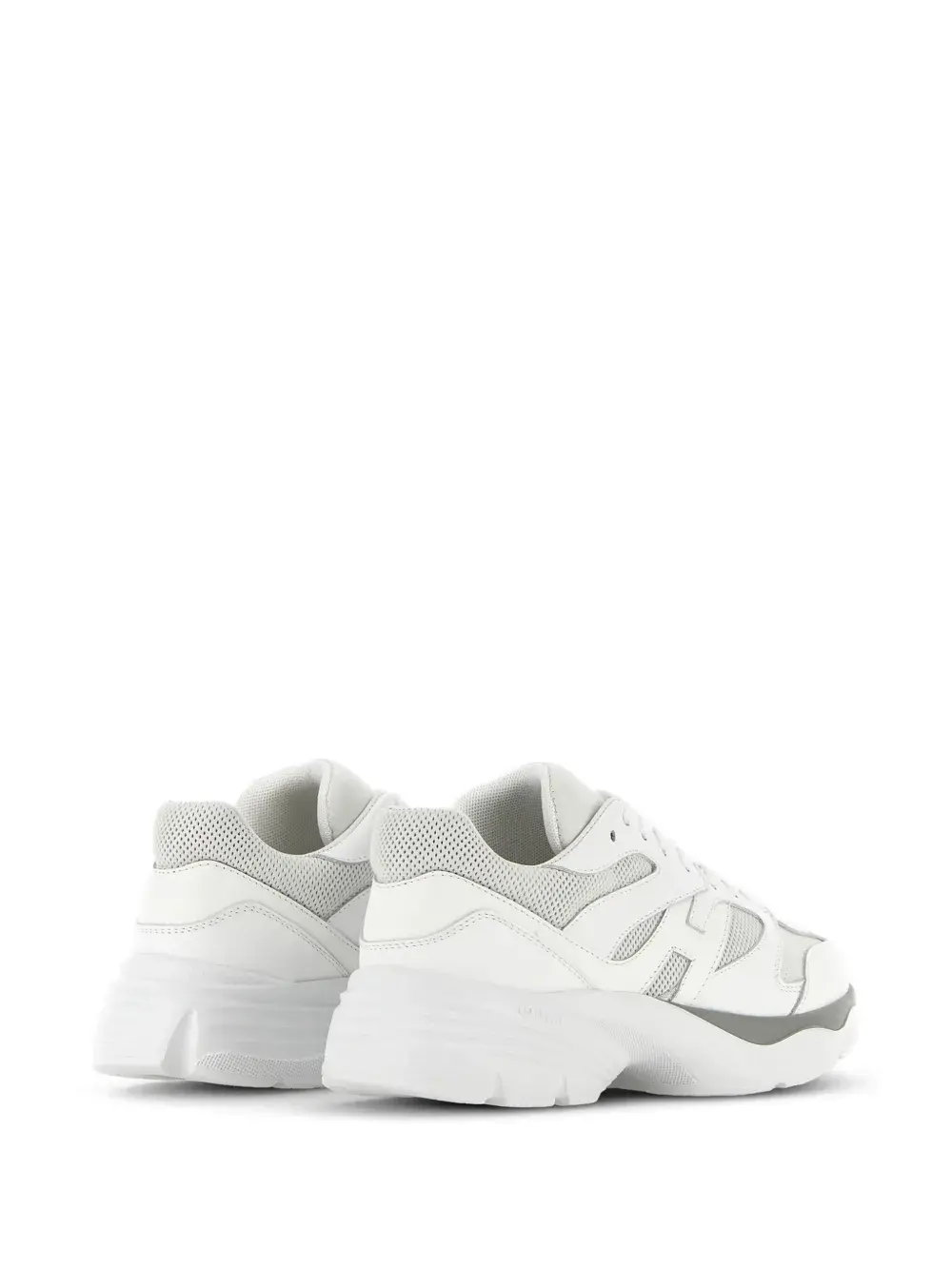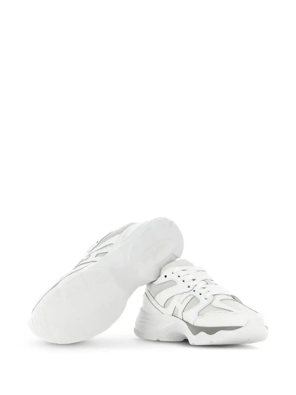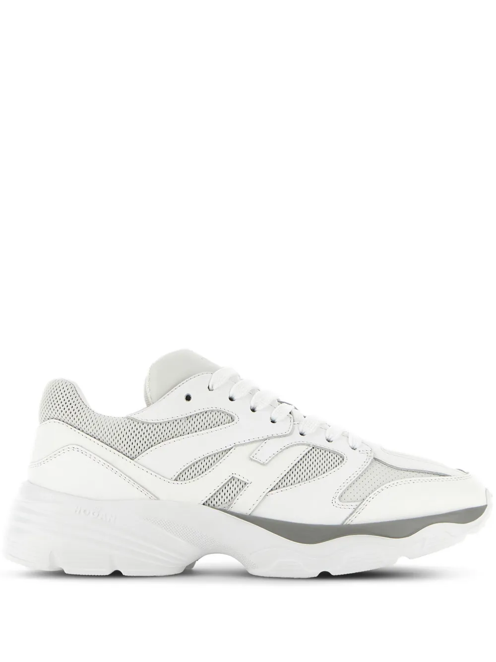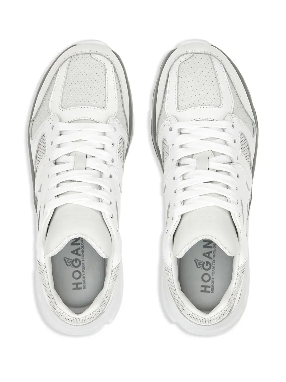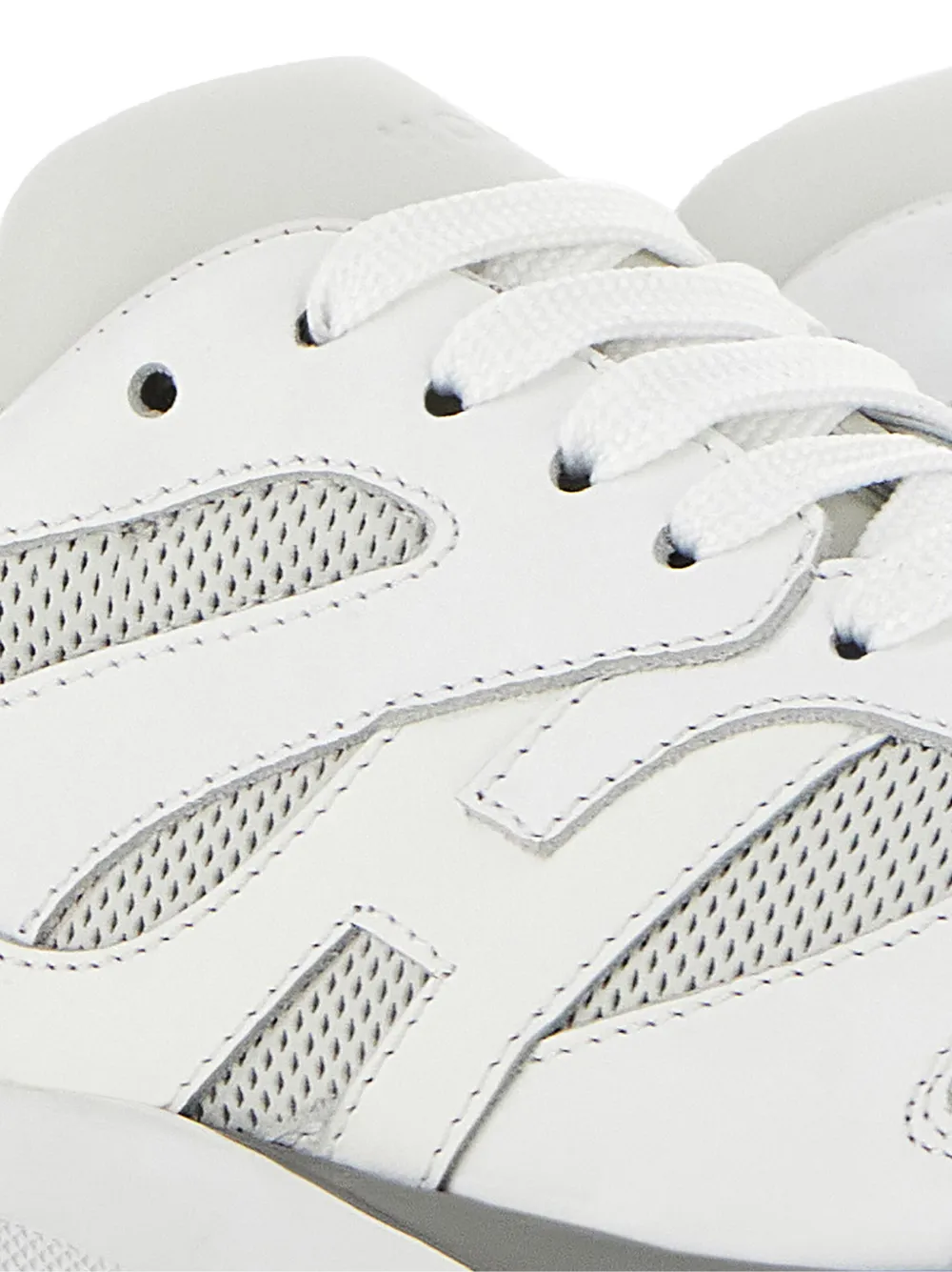 Белый, телячья кожа, сетчатые вставки, нашивка с логотипом сбоку, нашивка с логотипом на язычке, закругленный носок, шнуровка спереди, стелька с логотипом и массивная резиновая подошва.