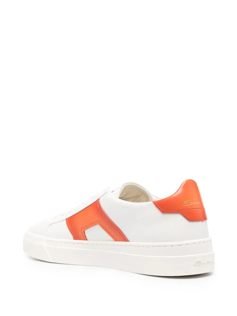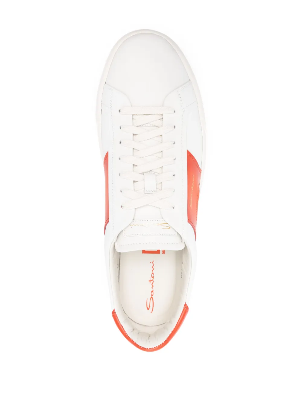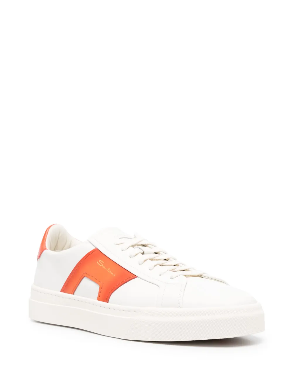 Белый, оранжевый, телячья кожа, вставки, логотип сбоку, язычок с логотипом, контрастный задник с логотипом, закругленный носок, шнуровка спереди, плоская резиновая подошва и стелька с логотипом.