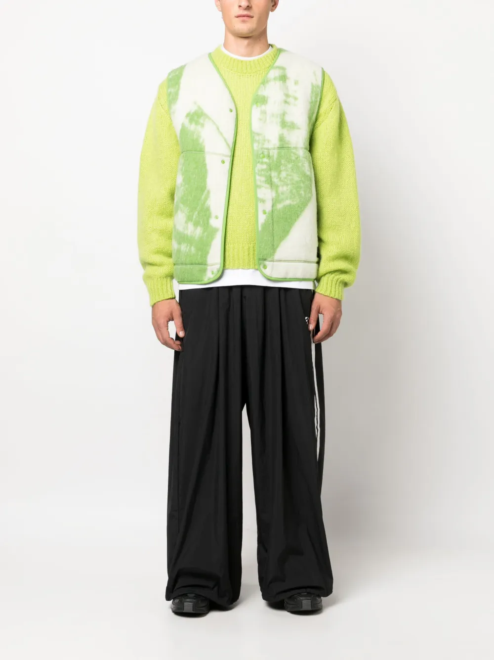 Кремовый, зеленый, смесовая шерсть, переработанный полиамид, фетровый материал, сплошной графичный принт, нашивка с логотипом спереди, декоративная строчка, V-образный вырез, застежка на кнопках спереди, завязки по бокам, без рукавов, два прорезных кармана по бокам и прямой подол.