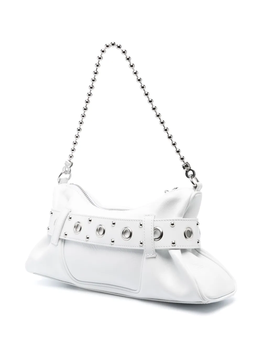 Белый, телячья кожа, серебристый металлический логотип, серебристая фурнитура, декоративные пряжки, съемная верхняя ручка, цепочный ремень, застежка на молнии сверху, основное отделение, нашивка с логотипом внутри и внутренний прорезной карман.