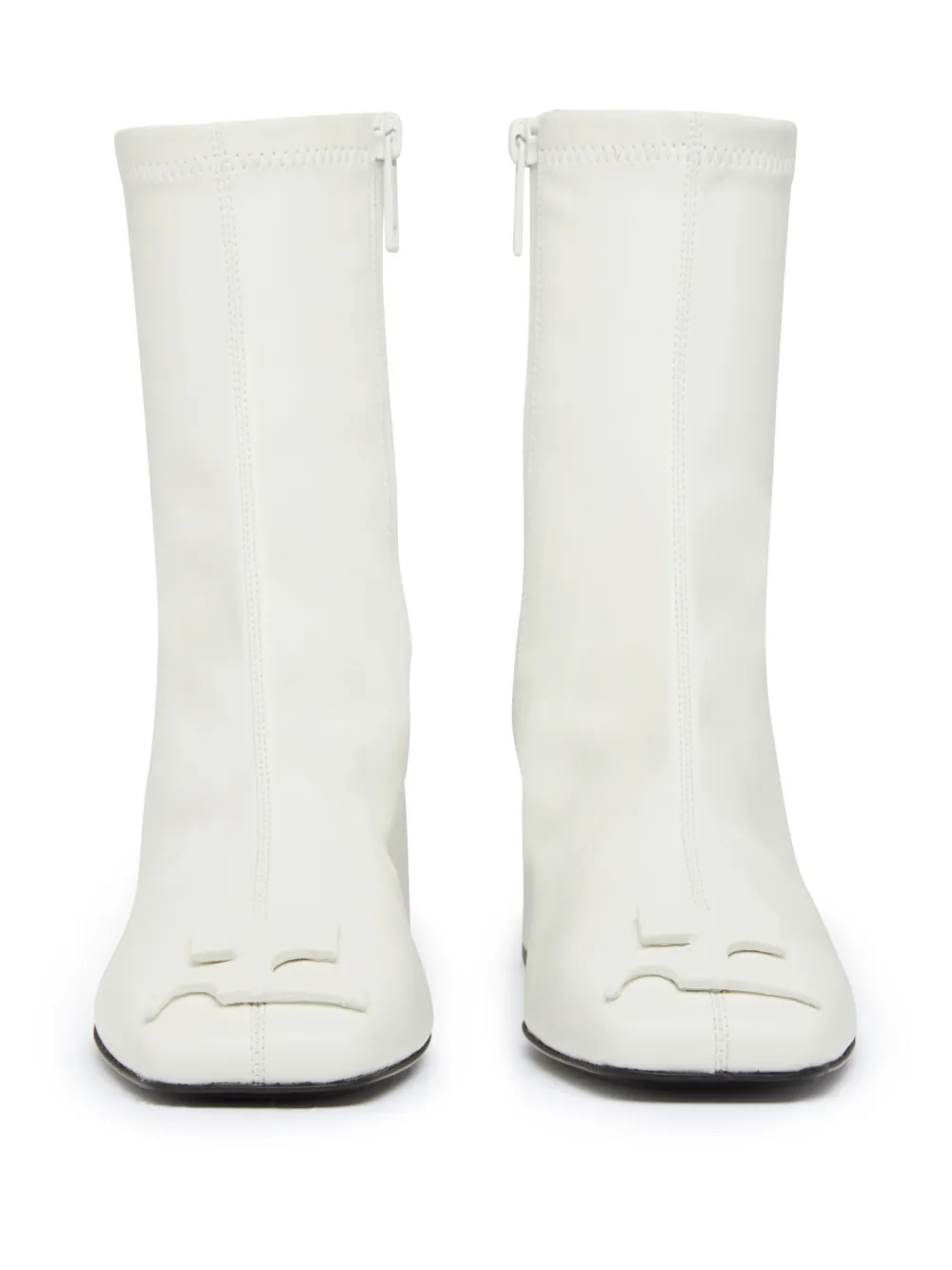 Белый, искусственная кожа, строчка в тон, нашивка с логотипом спереди, квадратный носок, застежка на молнии сбоку, стелька с логотипом, блочный каблук и высота по щиколотку.