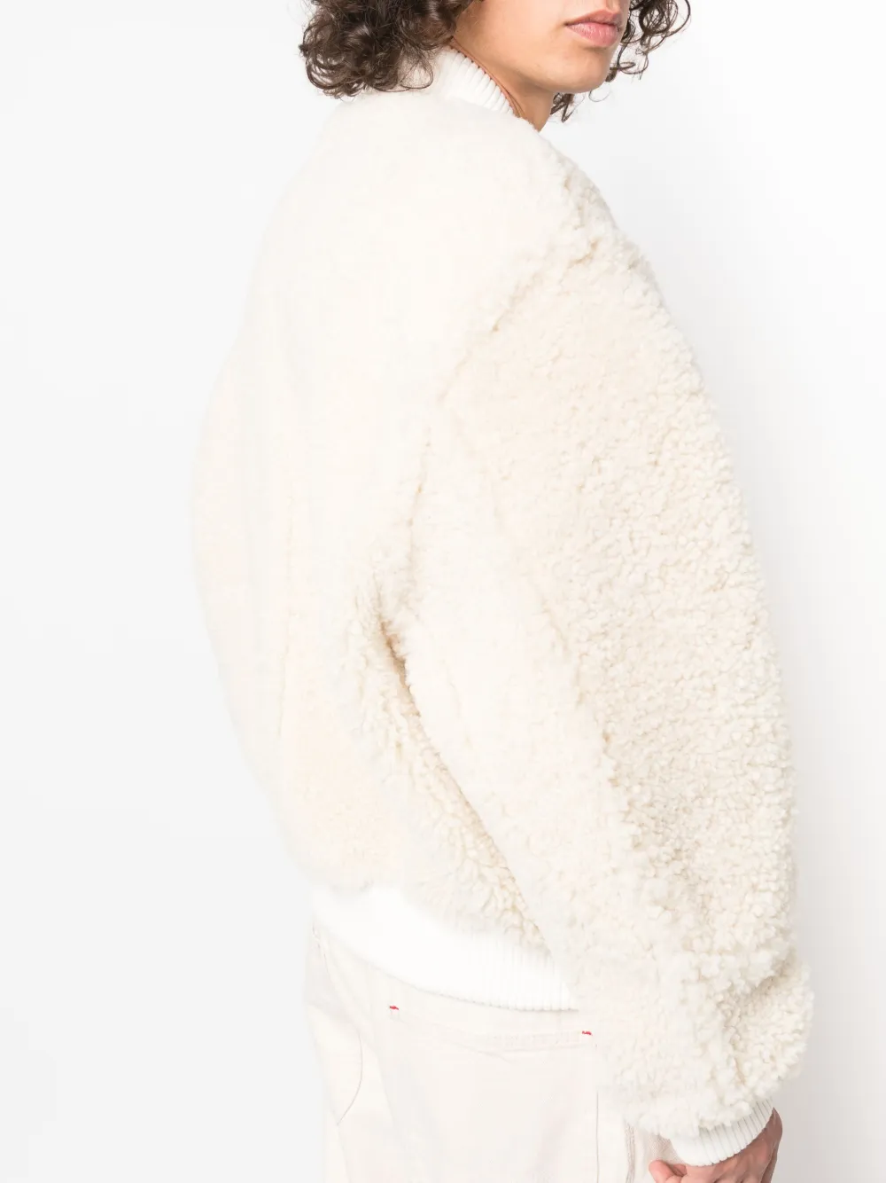 Кремовый, овчина, отделка в рубчик, бейсбольный воротник, застежка на молнии спереди, два прорезных кармана сбоку, длинные рукава и прямой подол.
