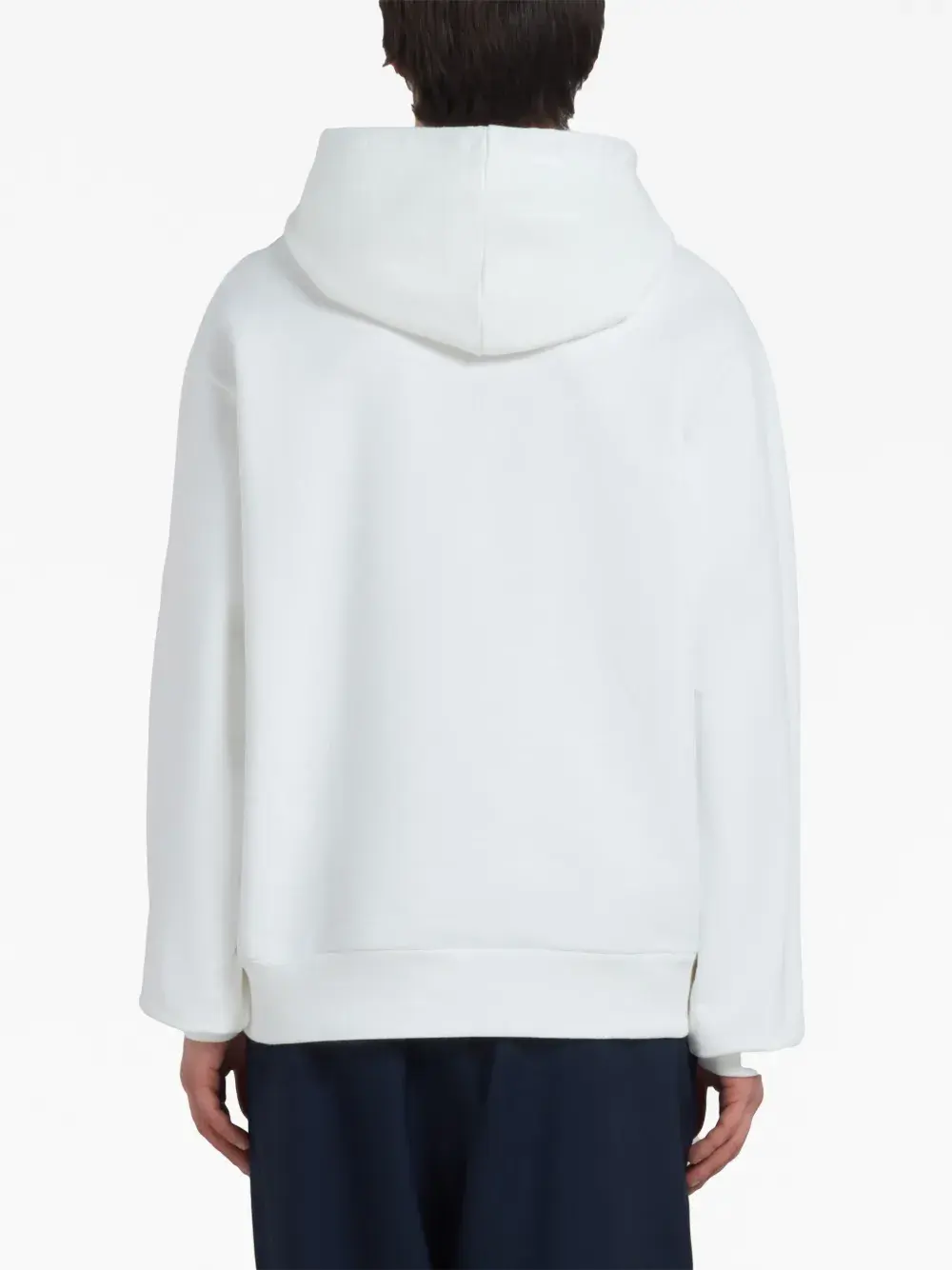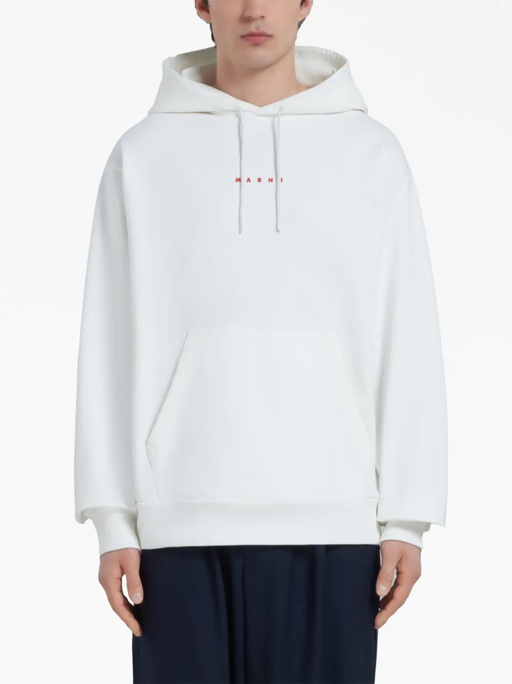 Молочно-белый, хлопок, принт с логотипом на груди, объемный капюшон на шнурке, карман-муфта, приспущенные плечи, длинные рукава, эластичные манжеты и прямой подол.