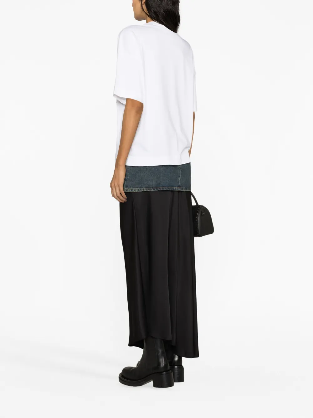 Белый, хлопок, фотопринт, принт с логотипом на груди, круглый вырез, короткие рукава и прямой подол.