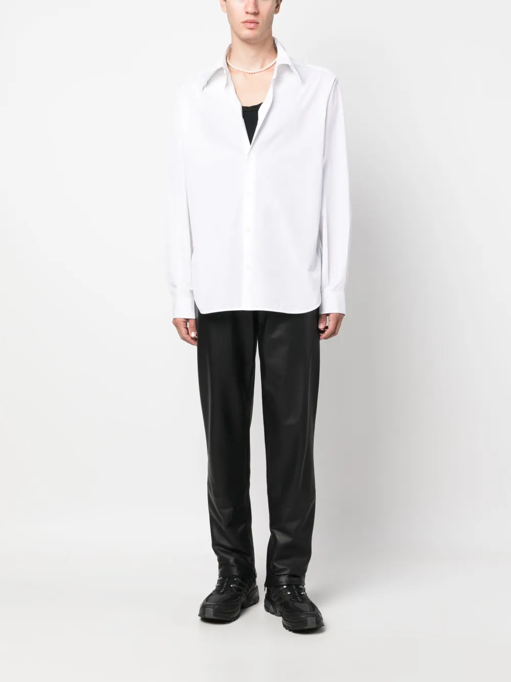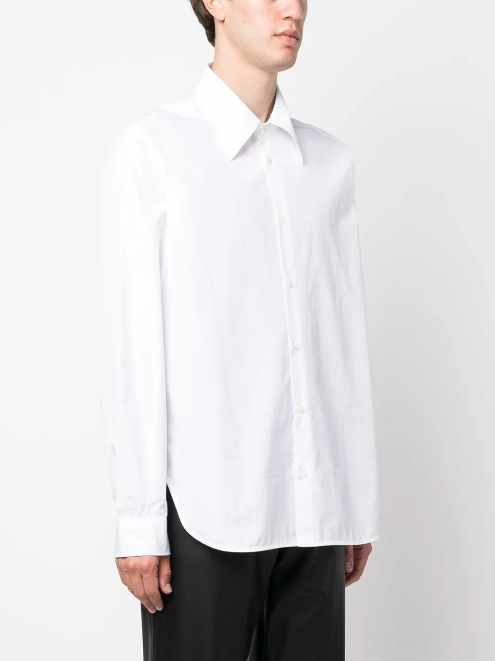 Поплин, встречная складка, манжеты на пуговицах и боковые разрезы.
