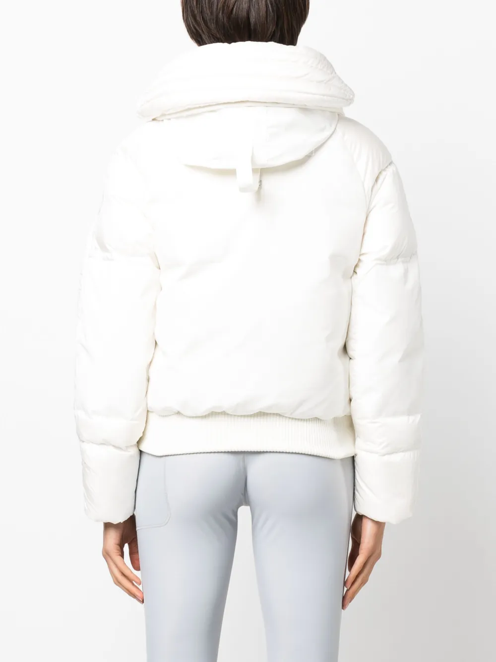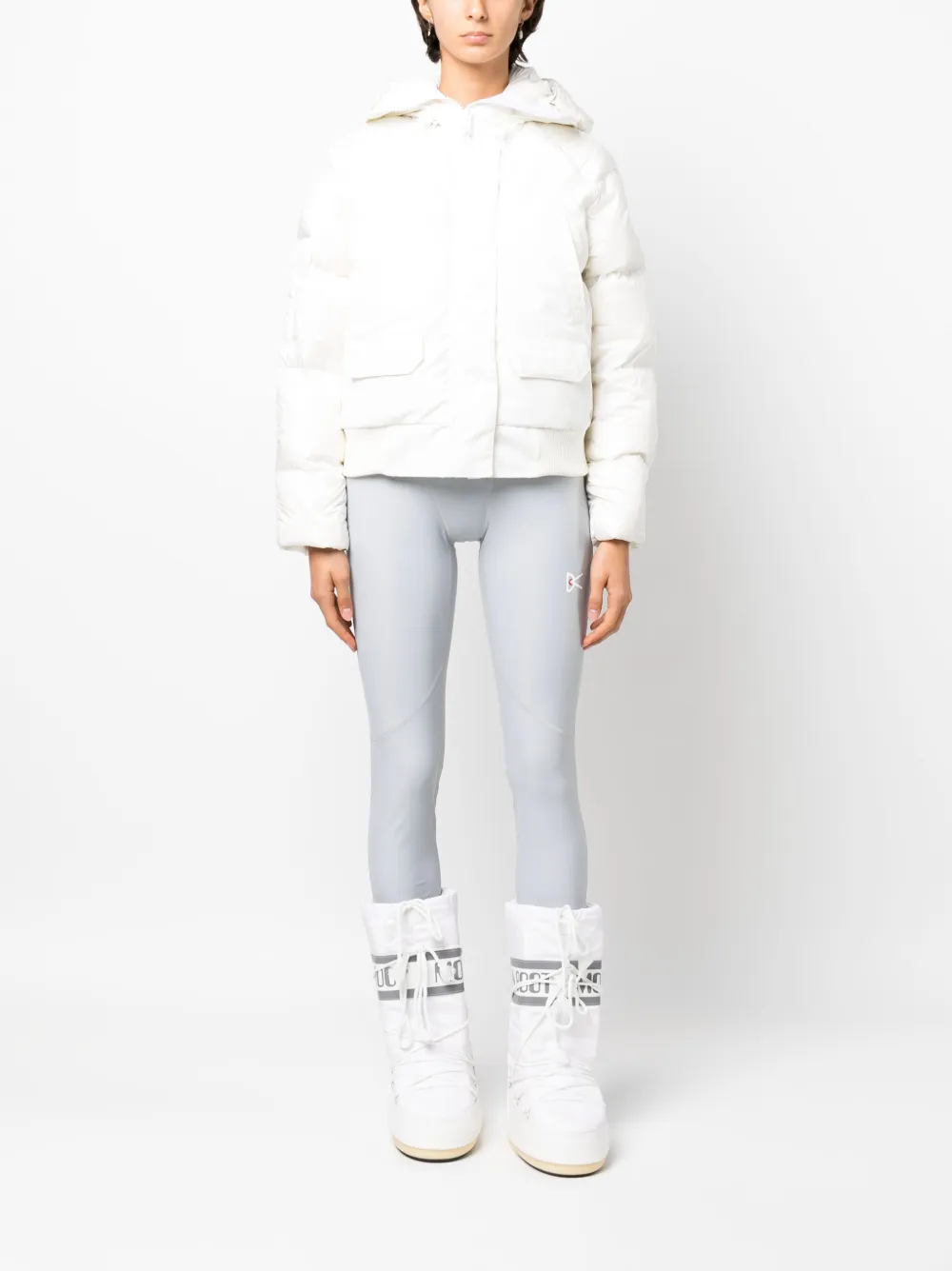 Белый, утиный пух, дутый материал, стеганая модель, нашивка с логотипом на рукаве, классический капюшон, потайная молния спереди, длинные рукава, два накладных кармана спереди и прямой подол.