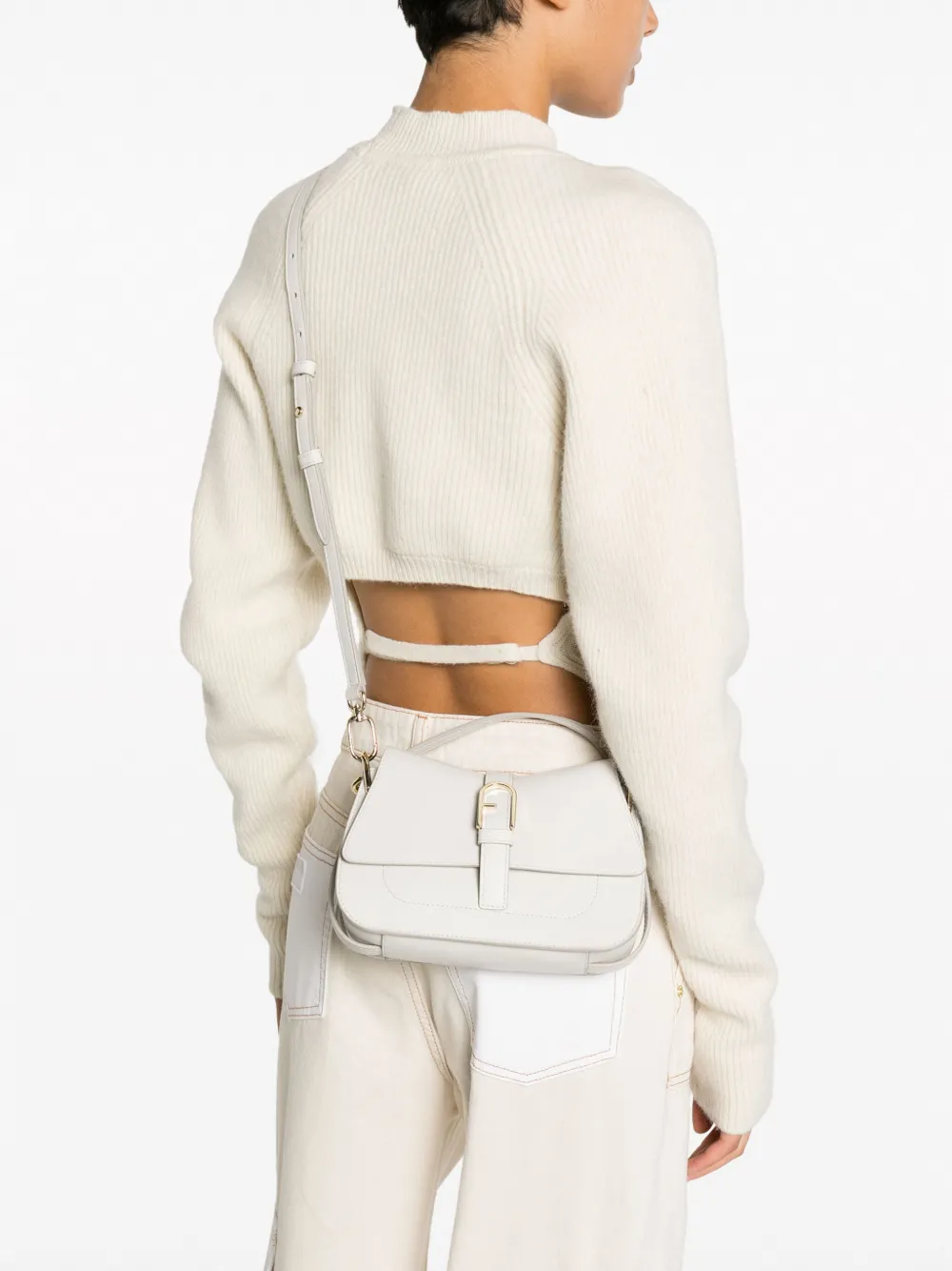 Цвет слоновой кости, телячья кожа, металлический логотип, золотистая фурнитура, откидной клапан на магните, верхняя ручка, съемный регулируемый ремень на плечо, основное отделение, накладной карман сзади, нашивка с логотипом внутри и внутренние накладные карманы.