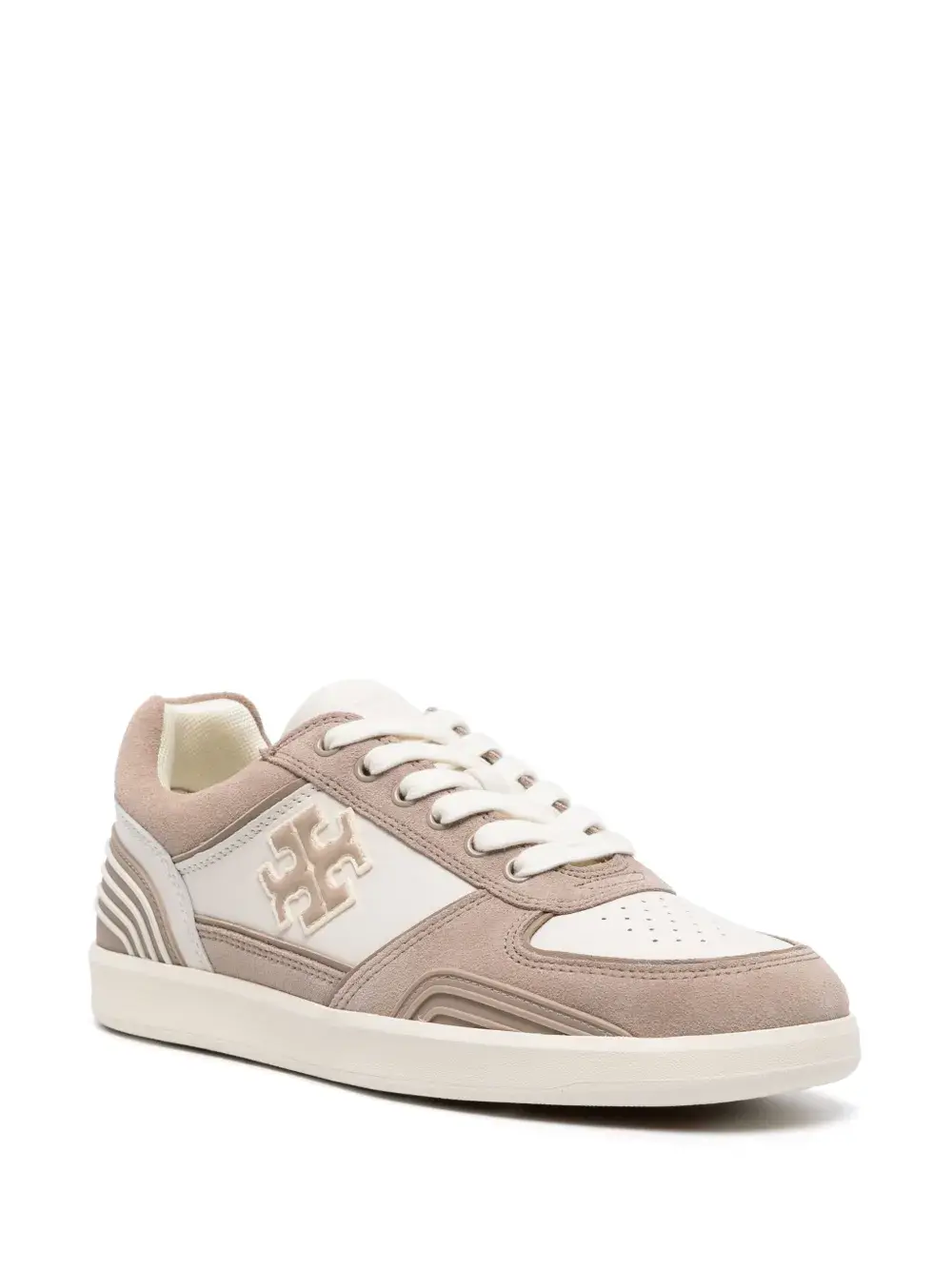 Белый, серо-бежевый, телячья кожа, вставки, замшевые вставки, декор Double T, закругленный носок, перфорированный носок, шнуровка спереди, тисненый логотип на язычке, задник с логотипом и плоская резиновая подошва.