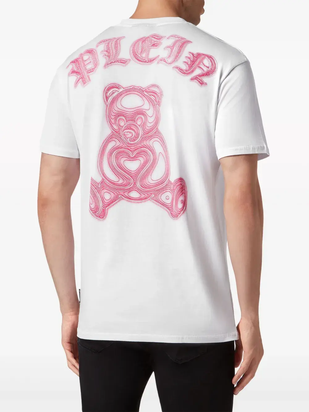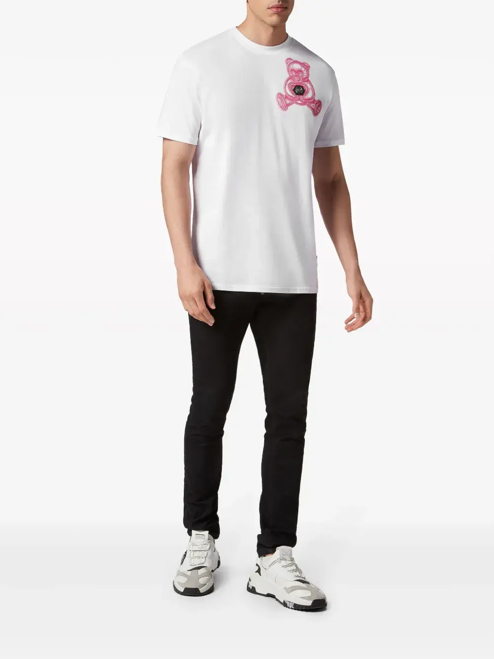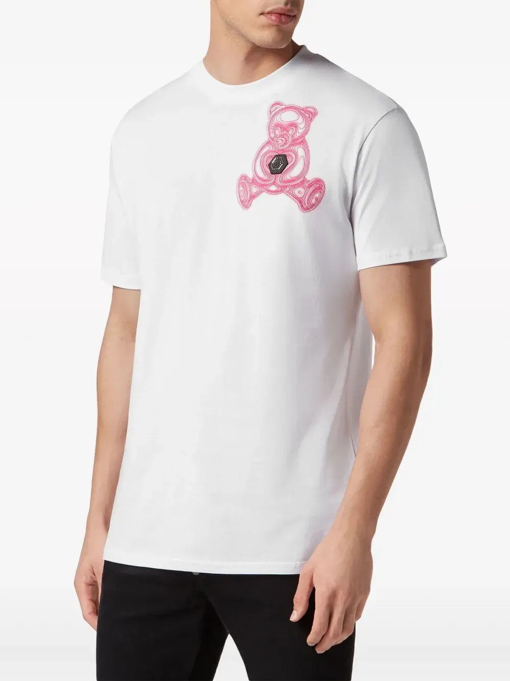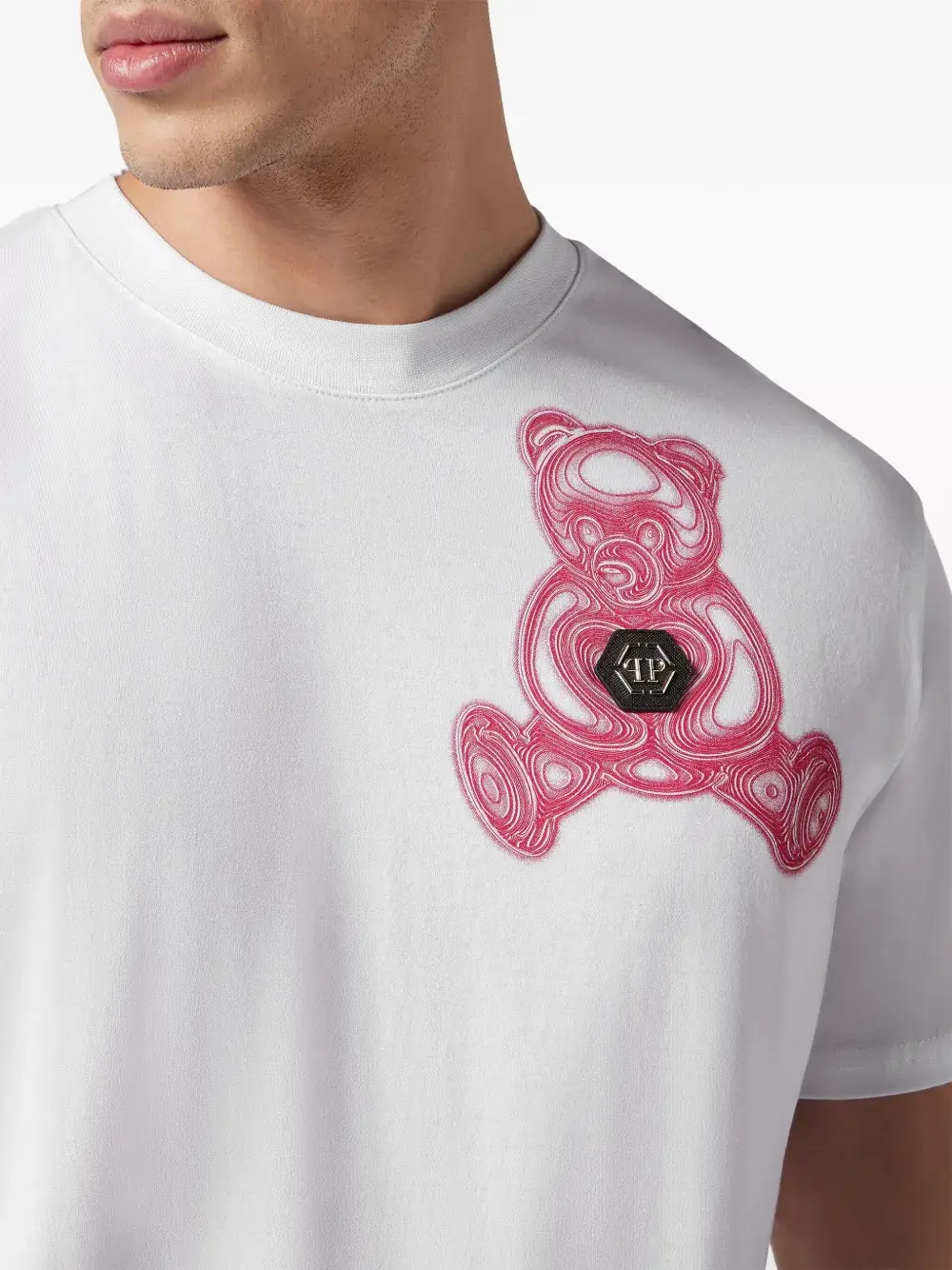 Белый, хлопок, принт с изображением плюшевого медведя, круглый вырез, короткие рукава и прямой подол.
